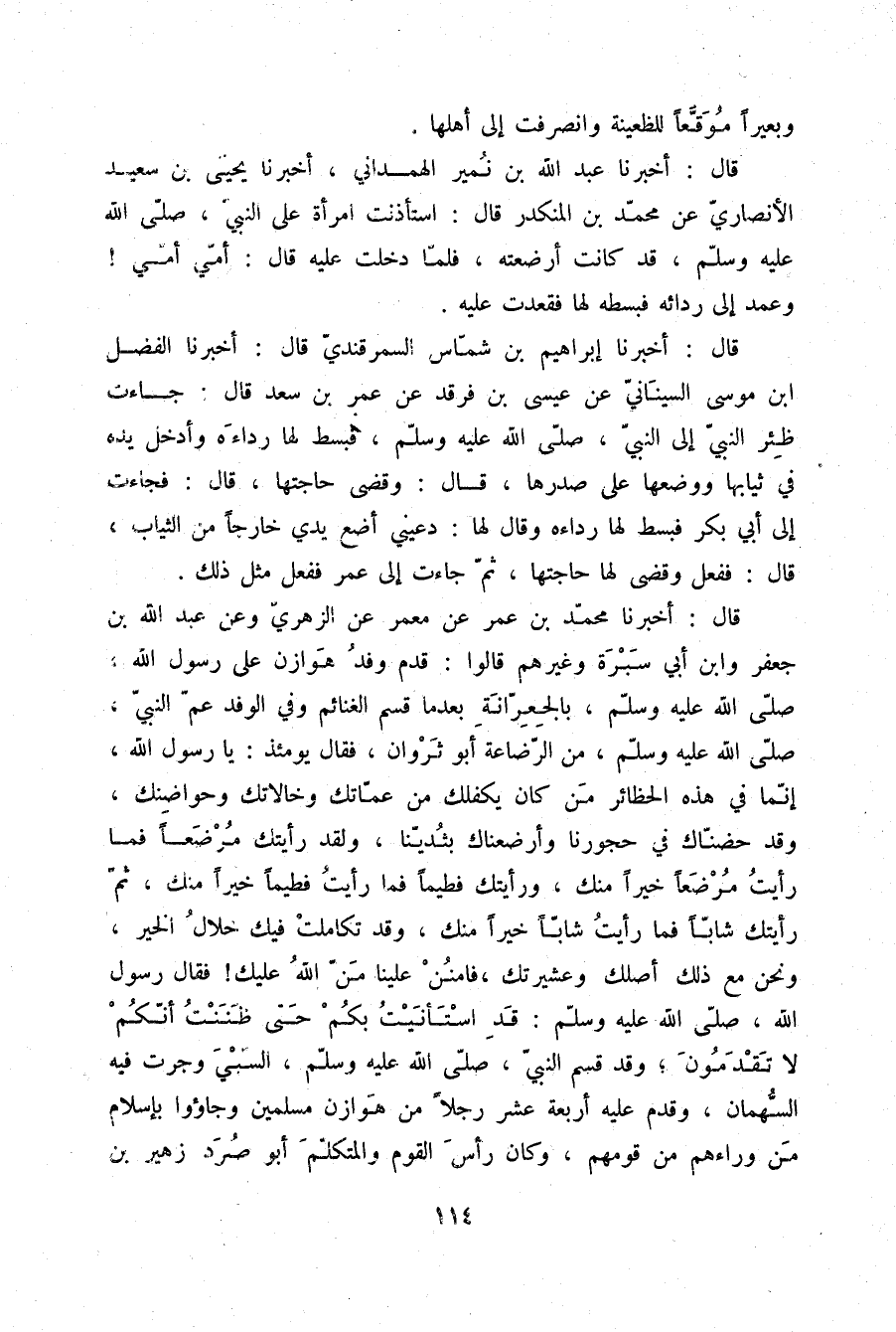 قَالَ: أَخْبَرَنَا مُحَمَّدُ بْنُ عُمَرَ، عَنْ مَعْمَرٍ، عَنِ الزُّهْرِيِّ، وَعَنْ عَبْدِ اللَّهِ بْنِ جَعْفَرٍ، وَابْنِ أَبِي سَبْرَةَ وَغَيْرِهِمْ، قَالُوا: قَدِمَ وَفْدُ هَوَازِنَ عَلَى رَسُولِ اللَّهِ صلّى الله عليه وسلم بِالْجِعْرَانَةِ بَعْدَمَا قَسَّمَ الْغَنَائِمَ وَفِي الْوَفْدِ عَمُّ النَّبِيِّ صلّى الله عليه وسلم مِنَ الرَّضَاعَةِ أَبُو ثَرْوَانَ، فَقَالَ يَوْمَئِذٍ: يَا رَسُولَ اللَّهِ، إِنَّمَا فِي هَذِهِ الْحَظَائِرِ مَنْ كَانَ يَكْفُلُكَ مِنْ عَمَّاتِكَ وَخَالَاتِكَ وَحَوَاضِنِكَ، وَقَدْ حَضَنَّاكَ فِي حُجُورِنَا، وَأَرْضَعْنَاكَ بِثَدْيِنَا، وَلَقَدْ رَأَيْتُكَ مُرْضَعًا، فَمَا رَأَيْتُ مُرْضَعًا خَيْرًا مِنْكَ، وَرَأَيْتُكَ فَطِيمًا فَمَا رَأَيْتُ فَطِيمًا خَيْرًا مِنْكَ، ثُمَّ رَأَيْتُكَ شَابًّا فَمَا رَأَيْتُ شَابًّا خَيْرًا مِنْكَ، وَقَدْ تَكَامَلَتْ فِيكَ خِلَالُ الْخَيْرِ، وَنَحْنُ مَعَ ذَلِكَ أَصْلُكَ وَعَشِيرَتُكَ، فَامْنُنْ عَلَيْنَا مَنَّ اللَّهُ عَلَيْكَ، فَقَالَ رَسُولُ اللَّهِ صلّى الله عليه وسلم: «قَدِ §اسْتَأْنَيْتُ بِكُمْ حَتَّى ظَنَنْتُ أَنَّكُمْ لَا تَقْدَمُونَ» وَقَدْ قَسَمَ النَّبِيُّ صلّى الله عليه وسلم السَّبْيَ وَجَرَتْ فِيهِ السُّهْمَانُ، وَقَدِمَ عَلَيْهِ أَرْبَعَةَ عَشَرَ رَجُلًا مِنْ هَوَازِنَ مُسْلِمِينِ وَجَاءُوا بِإِسْلَامِ مَنْ وَرَاءَهُمْ مِنْ قَوْمِهِمْ، وَكَانَ رَأْسُ الْقَوْمِ، وَالْمُتَكَلِّمُ أَبُو صُرَدٍ زُهَيْرُ بْنُ