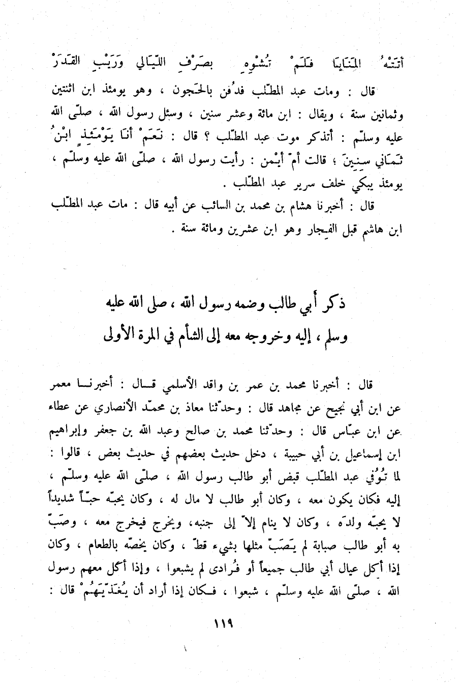 قَالَ: أَخْبَرَنَا مُحَمَّدُ بْنُ عُمَرَ بْنِ وَاقِدٍ الْأَسْلَمِيُّ قَالَ: أَخْبَرَنَا مَعْمَرٌ، عَنِ ابْنِ أَبِي نَجِيحٍ، عَنْ مُجَاهِدٍ قَالَ: وَحَدَّثَنَا مُعَاذُ بْنُ مُحَمَّدٍ الْأَنْصَارِيُّ، عَنْ عَطَاءٍ، عَنِ ابْنِ عَبَّاسٍ قَالَ: وَحَدَّثَنَا مُحَمَّدُ بْنُ صَالِحٍ، وَعَبْدُ اللَّهِ بْنُ جَعْفَرٍ، وَإِبْرَاهِيمُ بْنُ إِسْمَاعِيلَ بْنِ أَبِي حَبِيبَةَ، دَخَلَ حَدِيثُ بَعْضِهِمْ فِي حَدِيثِ بَعْضٍ، قَالُوا: §لَمَّا تُوُفِّيَ عَبْدُ الْمُطَّلِبِ قَبَضَ أَبُو طَالِبٍ رَسُولَ اللَّهِ صلّى الله عليه وسلم إِلَيْهِ، فَكَانَ يَكُونُ مَعَهُ، وَكَانَ أَبُو طَالِبٍ لَا مَالَ لَهُ، وَكَانَ يُحِبُّهُ حُبًّا شَدِيدًا لَا يُحِبُّهُ وَلَدَهُ، وَكَانَ لَا يَنَامُ إِلَّا إِلَى جَنْبِهِ، وَيَخْرُجُ فَيَخْرُجُ مَعَهُ، وَصَبَا بِهِ أَبُو طَالِبٍ صَبَابَةً لَمْ يَصْبُ مِثْلَهَا بِشَيْءٍ قَطُّ، وَكَانَ يَخُصُّهُ بِالطَّعَامِ، وَكَانَ إِذَا أَكَلَ عِيَالُ أَبِي طَالِبٍ جَمِيعًا أَوْ فُرَادَى لَمْ يَشْبَعُوا، وَإِذَا أَكَلَ مَعَهُمْ رَسُولُ اللَّهِ صلّى الله عليه وسلم شَبِعُوا، فَكَانَ إِذَا أَرَادَ أَنْ يُغَذِّيَهُمْ قَالَ