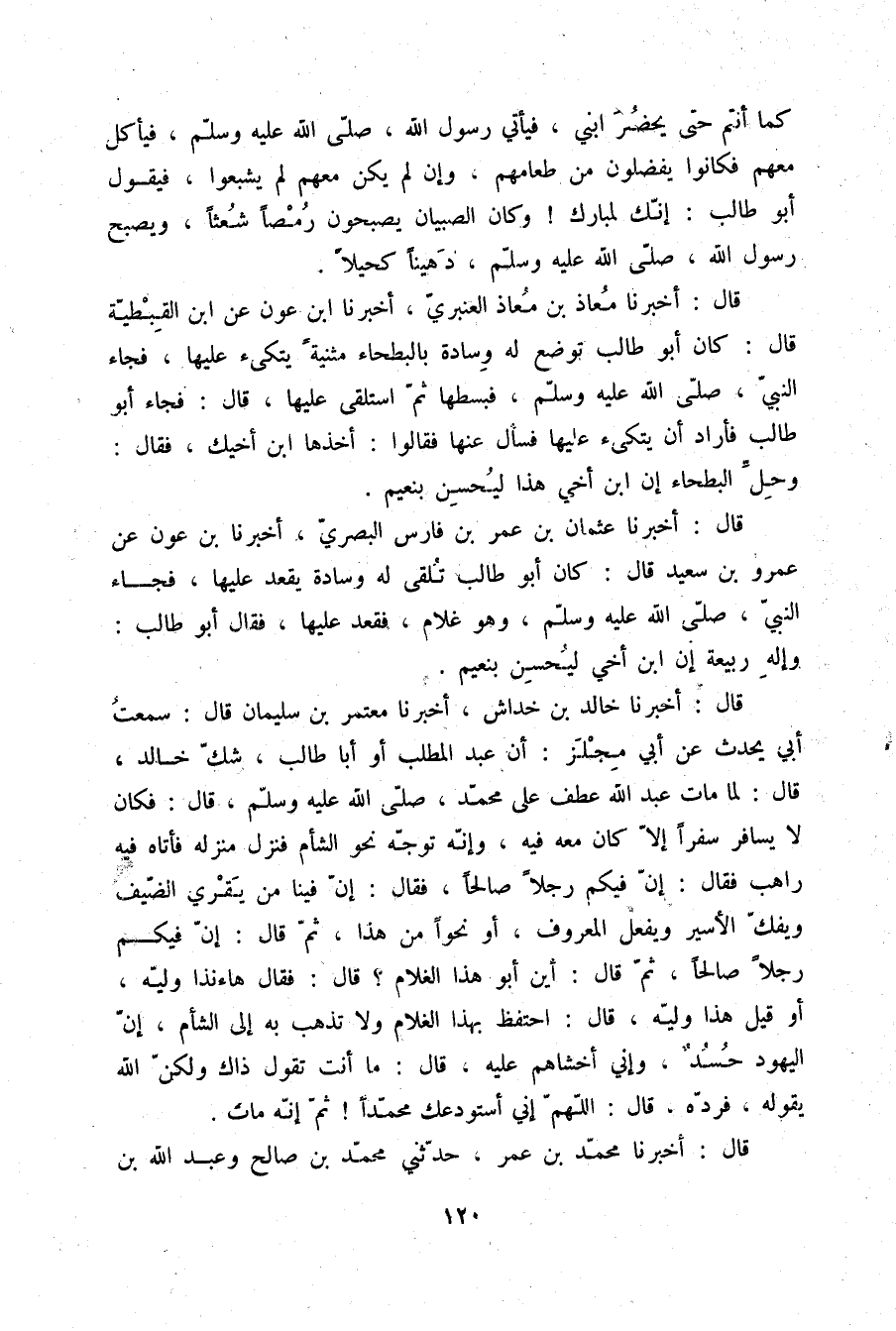 قَالَ: أَخْبَرَنَا مُعَاذُ بْنُ مُعَاذٍ الْعَنْبَرِيُّ، أَخْبَرَنَا ابْنُ عَوْنٍ، عَنِ ابْنِ الْقِبْطِيَّةِ قَالَ: كَانَ §أَبُو طَالِبٍ تُوضَعُ لَهُ وِسَادَةٌ بِالْبَطْحَاءِ مَثْنِيَّةً يَتَّكِئُ عَلَيْهَا، فَجَاءَ النَّبِيُّ صلّى الله عليه وسلم فَبَسَطَهَا ثُمَّ اسْتَلْقَى عَلَيْهَا قَالَ: فَجَاءَ أَبُو طَالِبٍ فَأَرَادَ أَنْ يَتَّكِئَ عَلَيْهَا فَسَأَلَ عَنْهَا، فَقَالُوا: أَخَذَهَا ابْنُ أَخِيكَ، فَقَالَ: وَحِلِّ الْبَطْحَاءِ؛ إِنَّ ابْنَ أَخِي هَذَا لَيُحْسِنُ بِنَعِيمٍ