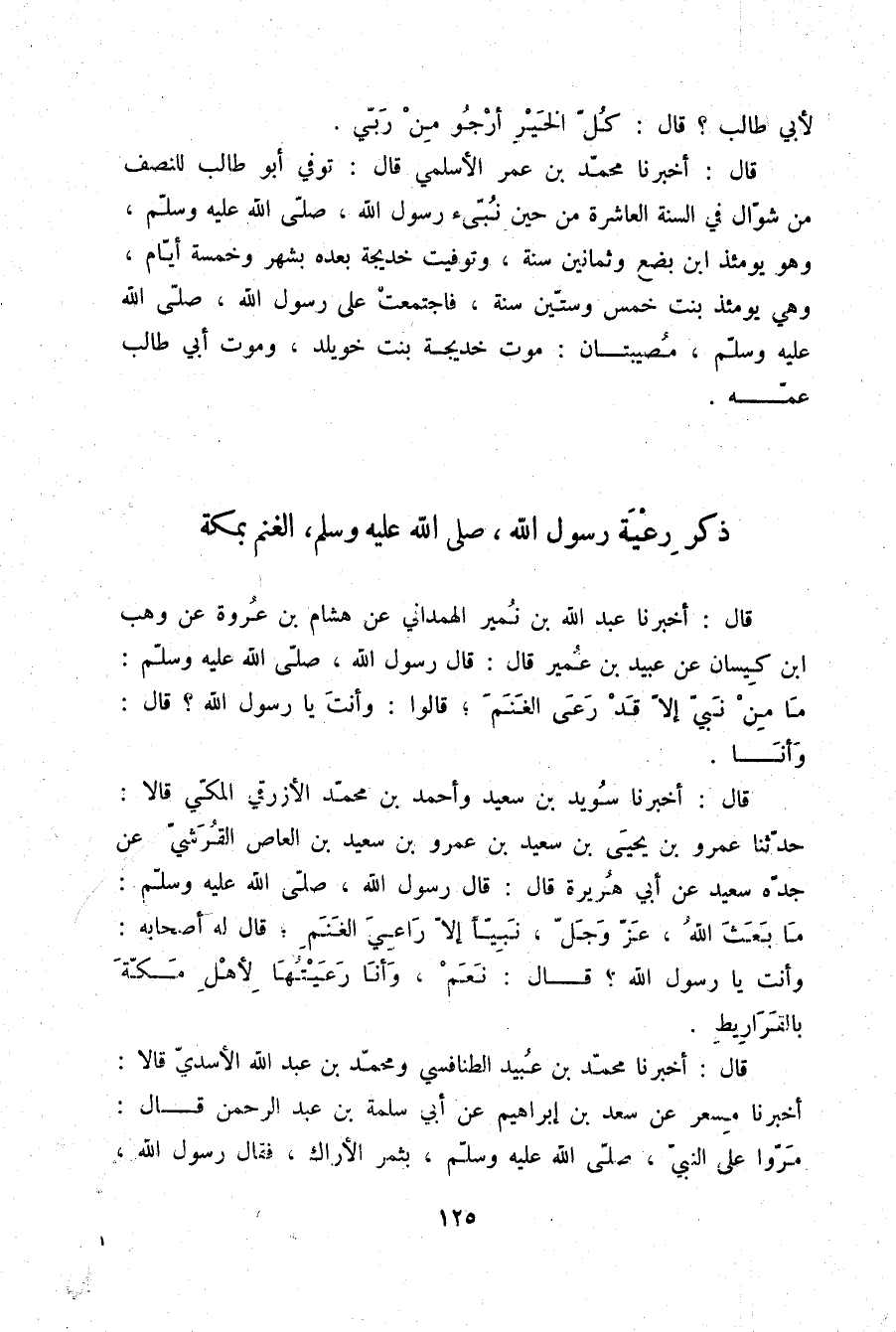 قَالَ: أَخْبَرَنَا مُحَمَّدُ بْنُ عُبَيْدٍ الطَّنَافِسِيُّ، وَمُحَمَّدُ بْنُ عَبْدِ اللَّهِ الْأَسَدِيُّ قَالَا: أَخْبَرَنَا مِسْعَرٌ، عَنْ سَعْدِ بْنِ إِبْرَاهِيمَ، عَنْ أَبِي سَلَمَةَ بْنِ عَبْدِ الرَّحْمَنِ قَالَ: مَرُّوا عَلَى النَّبِيِّ صلّى الله عليه وسلم بِثَمَرِ الْأَرَاكِ، فَقَالَ رَسُولُ اللَّهِ -[126]- صلّى الله عليه وسلم: «§عَلَيْكُمْ بِمَا اسْوَدَّ مِنْهُ، فَإِنِّي كُنْتُ أَجْتَنِيهِ إِذْ أَنَا رَاعِي الْغَنَمِ» قَالُوا: يَا رَسُولَ اللَّهِ: وَرَعَيْتَهَا؟ قَالَ: «نَعَمْ، وَمَا مِنْ نَبِيٍّ إِلَّا قَدْ رَعَاهَا»