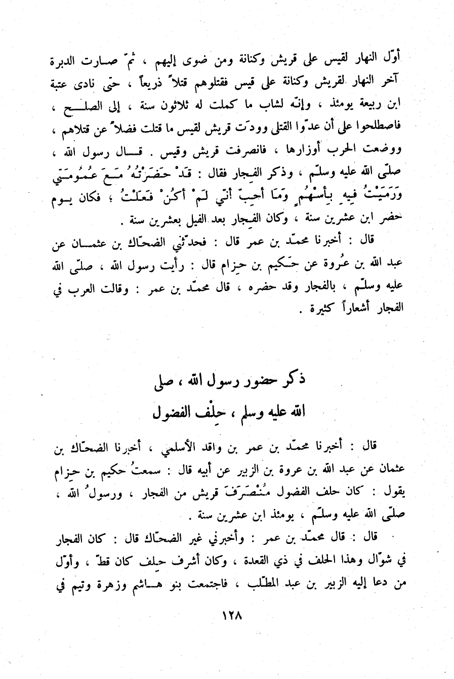 قَالَ: أَخْبَرَنَا مُحَمَّدُ بْنُ عُمَرَ بْنِ وَاقِدٍ الْأَسْلَمِيُّ، أَخْبَرَنَا الضَّحَّاكُ بْنُ عُثْمَانَ، عَنْ عَبْدِ اللَّهِ بْنِ عُرْوَةَ بْنِ الزُّبَيْرِ، عَنْ أَبِيهِ قَالَ: سَمِعْتُ حَكِيمَ بْنَ حِزَامٍ يَقُولُ: كَانَ §حِلْفُ الْفُضُولِ مُنْصَرِفَ قُرَيْشٍ مِنَ الْفِجَارِ، وَرَسُولُ اللَّهِ صلّى الله عليه وسلم يَوْمَئِذٍ ابْنُ عِشْرِينَ سَنَةً