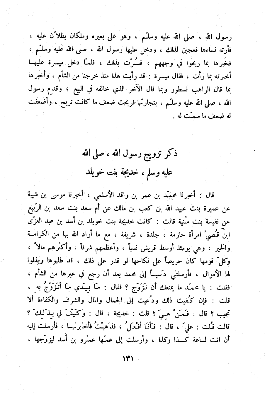 قَالَ: أَخْبَرَنَا مُحَمَّدُ بْنُ عُمَرَ بْنِ وَاقِدٍ الْأَسْلَمِيُّ، أَخْبَرَنَا مُوسَى بْنُ شَيْبَةَ، عَنْ عَمِيرَةَ بِنْتِ عُبَيْدِ اللَّهِ بْنِ كَعْبِ بْنِ مَالِكٍ، عَنْ أُمِّ سَعْدِ بِنْتِ سَعْدِ بْنِ الرَّبِيعِ، عَنْ نَفِيسَةَ بِنْتِ مُنْيَةَ قَالَتْ: كَانَتْ خَدِيجَةُ بِنْتُ خُوَيْلِدِ بْنِ أَسَدِ بْنِ عَبْدِ الْعُزَّى بْنِ قُصَيٍّ امْرَأَةً حَازِمَةً جَلْدَةً شَرِيفَةً مَعَ مَا أَرَادَ اللَّهُ بِهَا مِنَ الْكَرَامَةِ وَالْخَيْرِ، وَهِيَ يَوْمَئِذٍ أَوْسَطُ قُرَيْشٍ نَسَبًا وَأَعْظَمُهُمْ شَرَفًا وَأَكْثَرُهُمْ مَالًا، وَكُلُّ قَوْمِهَا كَانَ حَرِيصًا عَلَى نِكَاحِهَا لَوْ قَدَرَ عَلَى ذَلِكَ قَدْ طَلَبُوهَا وَبَذَلُوا لَهَا الْأَمْوَالَ فَأَرْسَلَتْنِي دَسِيسًا إِلَى مُحَمَّدٍ بَعْدَ أَنْ رَجَعَ فِي عِيرِهَا مِنَ الشَّامِ، فَقُلْتُ: يَا مُحَمَّدُ، مَا يَمْنَعُكَ أَنْ تَزَوَّجَ؟ فَقَالَ: «§مَا بِيَدِي مَا أَتَزَوَّجُ بِهِ» قُلْتُ: فَإِنْ كُفِيتَ ذَلِكَ، وَدُعِيتَ إِلَى الْجَمَالِ وَالْمَالِ وَالشَّرَفِ وَالْكَفَاءَةِ أَلَا تُجِيبُ؟ قَالَ: «فَمَنْ هِيَ؟» قُلْتُ: خَدِيجَةُ قَالَ: «وَكَيْفَ لِي بِذَلِكَ؟» قَالَتْ: قُلْتُ: عَلَيَّ، قَالَ: «فَأَنَا أَفْعَلُ» فَذَهَبْتُ، فَأَخْبَرْتُهَا، فَأَرْسَلَتْ إِلَيْهِ أَنِ ائْتِ لَسَاعَةِ كَذَا وَكَذَا، وَأَرْسَلَتْ إِلَى عَمِّهَا عَمْرِو بْنِ أَسَدٍ لِيُزَوِّجَهَا