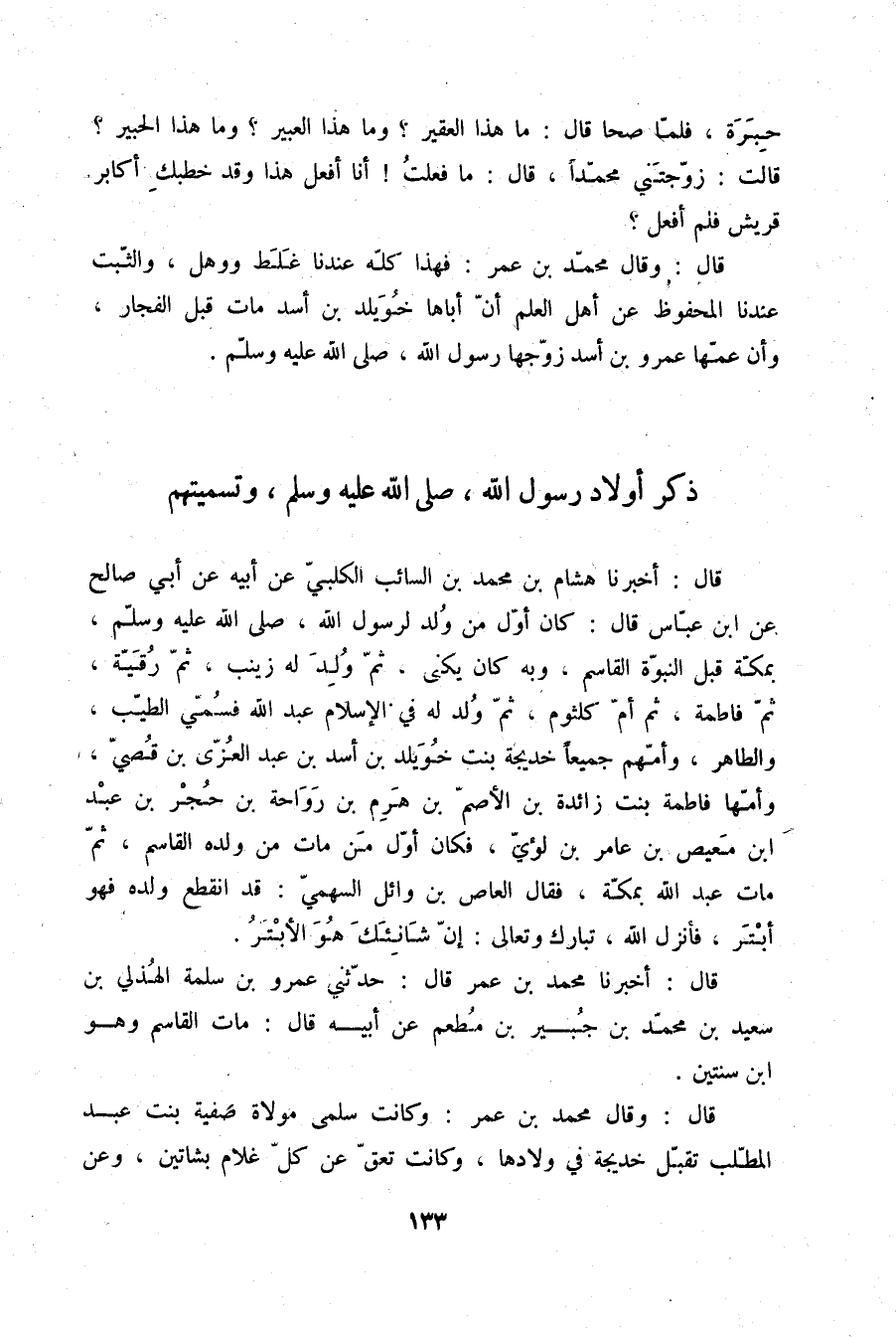 قَالَ: أَخْبَرَنَا هِشَامُ بْنُ مُحَمَّدِ بْنِ السَّائِبِ الْكَلْبِيُّ، عَنْ أَبِيهِ، عَنْ أَبِي صَالِحٍ، عَنِ ابْنِ عَبَّاسٍ قَالَ: كَانَ §أَوَّلُ مَنْ وُلِدَ لِرَسُولِ اللَّهِ صلّى الله عليه وسلم بِمَكَّةَ قَبْلَ النُّبُوَّةِ الْقَاسِمُ، وَبِهِ كَانَ يُكَنَّى، ثُمَّ وُلِدَ لَهُ زَيْنَبُ، ثُمَّ رُقَيَّةُ، ثُمَّ فَاطِمَةُ، ثُمَّ أُمُّ كُلْثُومٍ، ثُمَّ وُلِدَ لَهُ فِي الْإِسْلَامِ عَبْدُ اللَّهِ، فَسُمِّيَ الطَّيِّبَ وَالطَّاهِرَ، وَأُمُّهُمْ جَمِيعًا خَدِيجَةُ بِنْتُ خُوَيْلِدِ بْنِ أَسَدِ بْنِ عَبْدِ الْعُزَّى بْنِ قُصَيٍّ، وَأُمُّهَا فَاطِمَةُ بِنْتُ زَائِدَةَ بْنِ الْأَصَمِّ بْنِ هَرِمِ بْنِ رَوَاحَةَ بْنِ حُجْرِ بْنِ عَبْدِ بْنِ مَعِيصِ بْنِ عَامِرِ بْنِ لُؤَيٍّ، فَكَانَ أَوَّلَ مَنْ مَاتَ مِنْ وَلَدِهِ الْقَاسِمُ، ثُمَّ مَاتَ عَبْدُ اللَّهِ بِمَكَّةَ، فَقَالَ الْعَاصُ بْنُ وَائِلٍ السَّهْمِيُّ: قَدِ انْقَطَعَ وَلَدُهُ فَهُوَ أَبْتَرُ، فَأَنْزَلَ اللَّهُ تَبَارَكَ وَتَعَالَى {إِنَّ شَانِئَكَ هُوَ الْأَبْتَرُ} [الكوثر: 3]