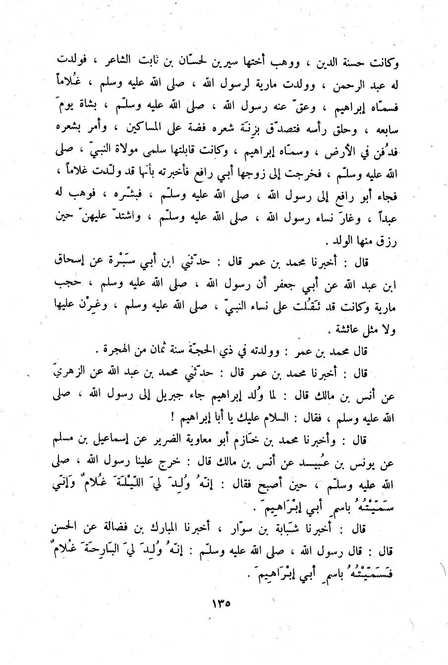 قَالَ: أَخْبَرَنَا مُحَمَّدُ بْنُ عُمَرَ قَالَ: حَدَّثَنِي مُحَمَّدُ بْنُ عَبْدِ اللَّهِ، عَنِ الزُّهْرِيِّ، عَنْ أَنَسِ بْنِ مَالِكٍ قَالَ: " §لَمَّا وُلِدَ إِبْرَاهِيمُ جَاءَ جِبْرِيلُ إِلَى رَسُولِ اللَّهِ صلّى الله عليه وسلم، فَقَالَ: السَّلَامُ عَلَيْكَ يَا أَبَا إِبْرَاهِيمَ "