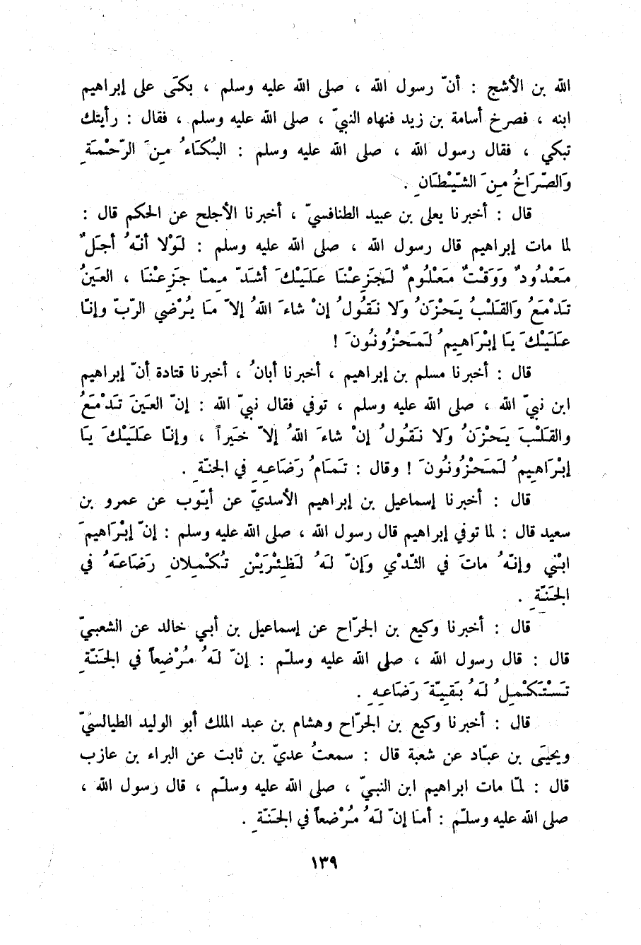قَالَ: أَخْبَرَنَا وَكِيعُ بْنُ الْجَرَّاحِ، وَهِشَامُ بْنُ عَبْدِ الْمَلِكِ أَبُو الْوَلِيدِ الطَّيَالِسِيُّ، وَيَحْيَى بْنُ عَبَّادٍ، عَنْ شُعْبَةَ قَالَ: سَمِعْتُ عَدِيَّ بْنَ ثَابِتٍ، عَنِ الْبَرَاءِ بْنِ عَازِبٍ قَالَ: لَمَّا مَاتَ إِبْرَاهِيمُ ابْنُ النَّبِيِّ صلّى الله عليه وسلم قَالَ رَسُولُ اللَّهِ صلّى الله عليه وسلم: «أَمَا إِنَّ §لَهُ مُرْضِعًا فِي الْجَنَّةِ»