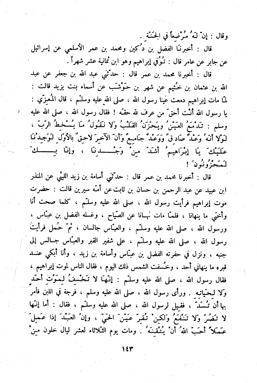 قَالَ: أَخْبَرَنَا مُحَمَّدُ بْنُ عُمَرَ قَالَ: حَدَّثَنِي عَبْدُ اللَّهِ بْنُ جَعْفَرٍ، عَنْ عَبْدِ اللَّهِ بْنِ عُثْمَانَ بْنِ خُثَيْمٍ، عَنْ شَهْرِ بْنِ حَوْشَبٍ، عَنْ أَسْمَاءَ بِنْتِ يَزِيدَ قَالَتْ: لَمَّا مَاتَ إِبْرَاهِيمُ دَمَعَتْ عَيْنَا رَسُولِ اللَّهِ صلّى الله عليه وسلم قَالَ الْمُعِزِّيُّ: يَا رَسُولَ اللَّهِ، أَنْتَ أَحَقُّ مَنْ عَرَفَ لِلَّهِ حَقَّهُ، فَقَالَ رَسُولُ اللَّهِ صلّى الله عليه وسلم: «§تَدْمَعُ الْعَيْنُ، وَيَحْزَنُ الْقَلْبُ، وَلَا نَقُولُ مَا يُسْخِطُ الرَّبَّ، لَوْلَا أَنَّهُ وَعْدٌ صَادِقٌ وَوَعْدٌ جَامِعٌ، وَأَنَّ الْآخِرَ لَاحِقٌ بِالْأَوَّلِ لَوَجِدْنَا عَلَيْكَ يَا إِبْرَاهِيمُ أَشَدَّ مِنْ وَجْدِنَا وَإِنَّا بِكَ لَمَحْزُونُونَ»