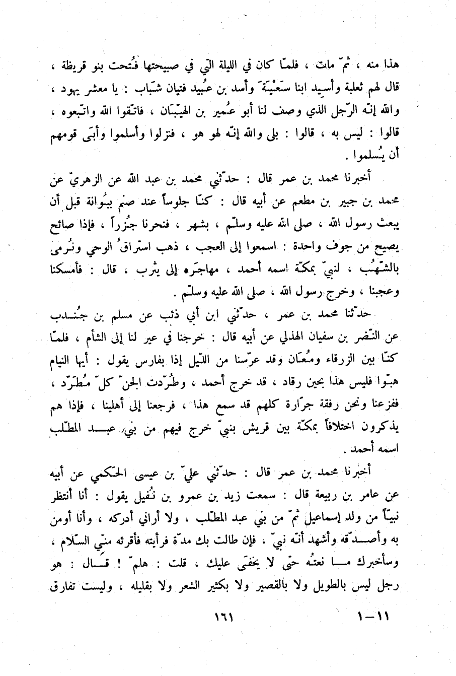 أَخْبَرَنَا مُحَمَّدُ بْنُ عُمَرَ قَالَ: حَدَّثَنِي مُحَمَّدُ بْنُ عَبْدِ اللَّهِ، عَنِ الزُّهْرِيِّ، عَنْ مُحَمَّدِ بْنِ جُبَيْرِ بْنِ مُعْطِمٍ، عَنْ أَبِيهِ قَالَ: كُنَّا جُلُوسًا عِنْدَ صَنَمٍ بِبُوَانَةَ قَبْلَ أَنْ يُبْعَثَ رَسُولُ اللَّهِ صلّى الله عليه وسلم بِشَهْرٍ، فَنَحَرْنَا جُزْرًا، فَإِذَا صَائِحٌ يَصِيحُ مِنْ جَوْفٍ وَاحِدَةٍ: §اسْمَعُوا إِلَى الْعَجَبِ، ذَهَبَ اسْتِرَاقُ الْوَحْيِ، وَنُرْمَى بِالشُّهُبِ لِنَبِيٍّ بِمَكَّةَ، اسْمُهُ أَحْمَدُ مُهَاجَرُهُ إِلَى يَثْرِبَ، قَالَ: فَأَمْسَكْنَا وَعَجِبْنَا، وَخَرَجَ رَسُولُ اللَّهِ صلّى الله عليه وسلم