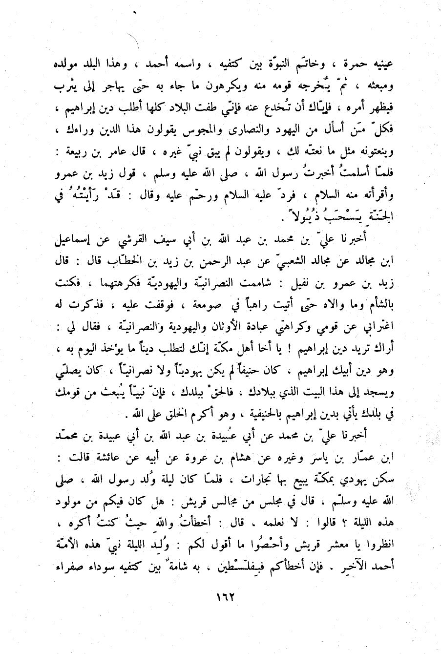 أَخْبَرَنَا عَلِيُّ بْنُ مُحَمَّدِ بْنِ عَبْدِ اللَّهِ بْنِ أَبِي سَيْفٍ الْقُرَشِيُّ، عَنْ إِسْمَاعِيلَ بْنِ مُجَالِدٍ، عَنْ مُجَالِدٍ عَنِ الشَّعْبِيِّ، عَنْ عَبْدِ الرَّحْمَنِ بْنِ زَيْدِ بْنِ الْخَطَّابِ قَالَ: قَالَ زَيْدُ بْنُ عَمْرِو بْنِ نُفَيْلٍ: §شَامَمْتُ النَّصْرَانِيَّةَ وَالْيَهُودِيَّةَ فَكَرِهْتُهُمَا، فَكُنْتُ بِالشَّامِ وَمَا وَالَاهُ حَتَّى أَتَيْتُ رَاهِبًا فِي صَوْمَعَةٍ، فَوَقَفْتُ عَلَيْهِ، فَذَكَرْتُ لَهُ اغْتِرَابِي عَنْ قَوْمِي وَكَرَاهَتِي عِبَادَةَ الْأَوْثَانِ وَالْيَهُودِيَّةَ وَالنَّصْرَانِيَّةَ، فَقَالَ لِي: أَرَاكَ تُرِيدُ دِينَ إِبْرَاهِيمَ يَا أَخَا أَهْلِ مَكَّةَ، إِنَّكَ لَتَطْلُبُ دِينًا مَا يُؤْخَذُ الْيَوْمَ بِهِ، وَهُوَ دِينُ أَبِيكَ إِبْرَاهِيمَ كَانَ حَنِيفًا لَمْ يَكُنْ يَهُودِيًّا وَلَا نَصْرَانِيًّا كَانَ يُصَلِّي وَيَسْجُدُ إِلَى هَذَا الْبَيْتِ الَّذِي بِبِلَادِكَ فَالْحَقْ بِبَلَدِكَ، فَإِنَّ نَبِيًّا يُبْعَثُ مِنْ قَوْمِكَ فِي بَلَدِكَ يَأْتِي بِدِينِ إِبْرَاهِيمَ بِالْحَنِيفِيَّةِ، وَهُوَ أَكْرَمُ الْخَلْقِ عَلَى اللَّهِ