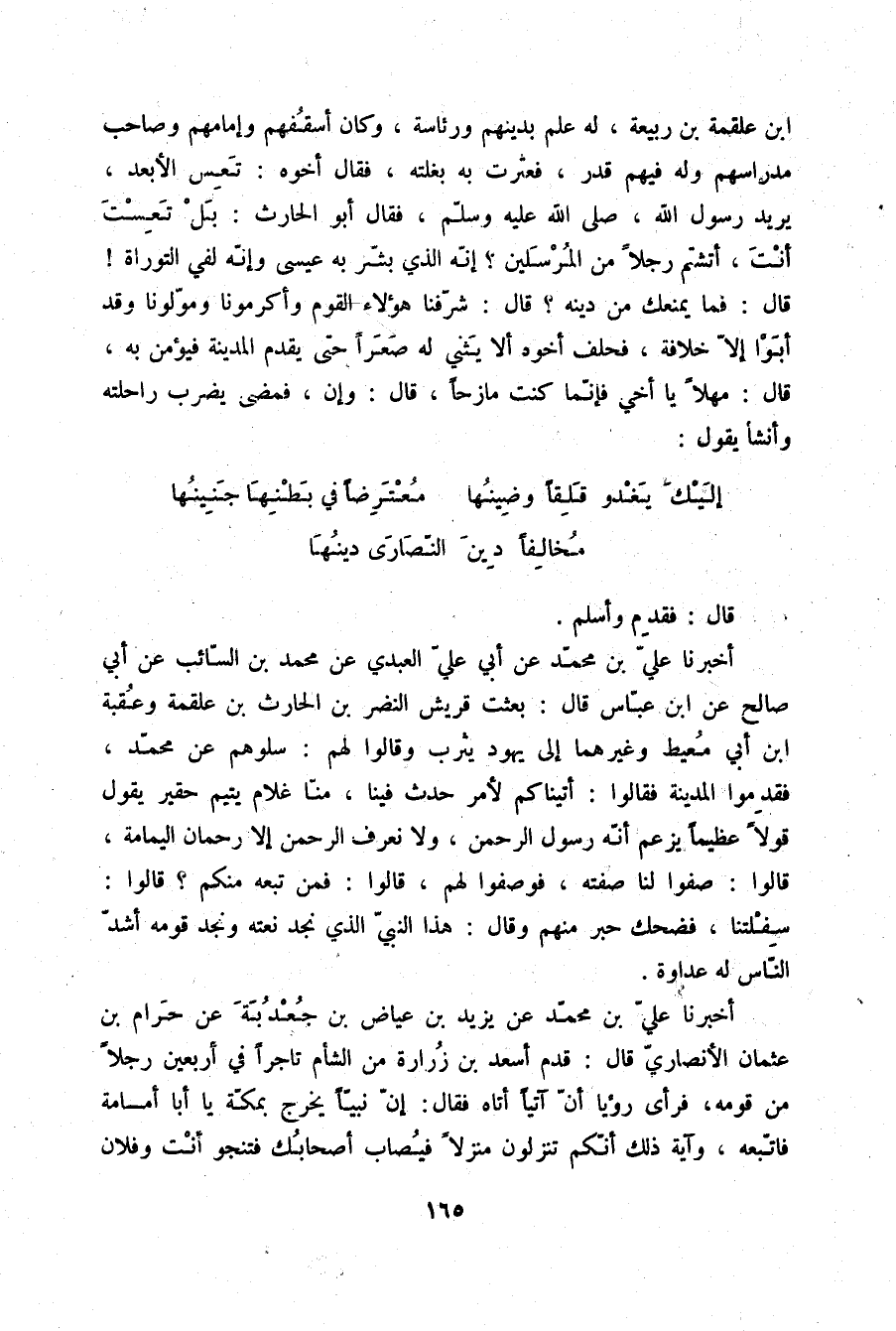 بْنُ عَلْقَمَةَ بْنِ رَبِيعَةَ لَهُ عِلْمٌ بِدِينِهِمْ وَرِئَاسَةٌ، وَكَانَ أَسْقُفَهُمْ وَإِمَامَهُمْ، وَصَاحِبَ مِدْرَاسِهِمْ، وَلَهُ فِيهِمْ قَدْرٌ، فَعَثَرَتْ بِهِ بَغْلَتُهُ، فَقَالَ أَخُوهُ: تَعِسَ الْأَبْعَدُ يُرِيدُ رَسُولَ اللَّهِ صلّى الله عليه وسلم، فَقَالَ أَبُو الْحَارِثِ: بَلْ تَعِسْتَ أَنْتَ أَتَشْتِمُ رَجُلًا مِنَ الْمُرْسَلِينَ؟ إِنَّهُ الَّذِي بَشَّرَ بِهِ عِيسَى، وَإِنَّهُ لَفِي التَّوْرَاةِ، قَالَ: فَمَا يَمْنَعُكَ مِنْ دِينِهِ؟ قَالَ: شَرَّفَنَا هَؤُلَاءِ الْقَوْمُ وَأَكْرَمُونَا وَمَوَّلُونَا، وَقَدْ أَبَوْا إِلَّا خِلَافَهُ، فَحَلَفَ أَخُوهُ أَلَّا يَثْنِي لَهُ صَعَرًا حَتَّى يَقْدَمَ الْمَدِينَةَ فَيُؤْمِنَ بِهِ، قَالَ: مَهْلًا يَا أَخِي، فَإِنَّمَا كُنْتُ مَازِحًا، قَالَ: وَإِنْ، فَمَضَى يَضْرِبُ رَاحِلَتَهُ وَأَنْشَأَ يَقُولُ: