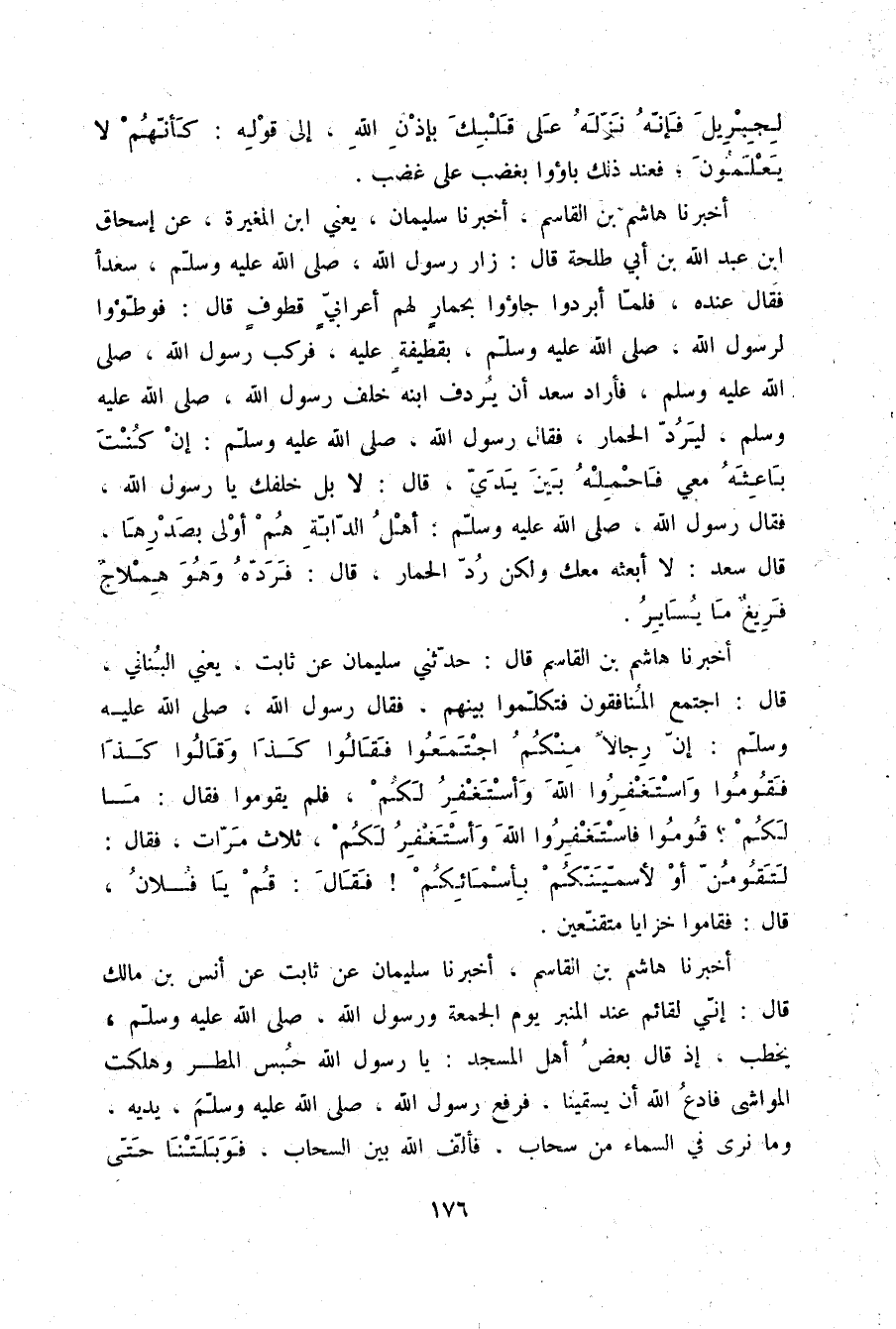 أَخْبَرَنَا هَاشِمُ بْنُ الْقَاسِمِ، أَخْبَرَنَا سُلَيْمَانُ، عَنْ ثَابِتٍ، عَنْ أَنَسِ بْنِ مَالِكٍ قَالَ: إِنِّي لَقَائِمٌ عِنْدَ الْمِنْبَرِ يَوْمَ الْجُمُعَةِ وَرَسُولُ اللَّهِ صلّى الله عليه وسلم يَخْطُبُ إِذْ قَالَ بَعْضُ أَهْلِ الْمَسْجِدِ: يَا رَسُولَ اللَّهِ حُبِسَ الْمَطَرُ وَهَلَكَتِ الْمَوَاشِي فَادْعُ اللَّهَ أَنْ يَسْقِيَنَا §فَرَفَعَ رَسُولُ اللَّهِ صلّى الله عليه وسلم يَدَيْهِ، وَمَا نَرَى فِي السَّمَاءِ مِنْ سَحَابٍ، فَأَلَّفَ اللَّهُ بَيْنَ السَّحَابِ فَوَبِلَتْنَا حَتَّى -[177]- رَأَيْتُ الرَّجُلَ الشَّدِيدَ تَهُمُّهُ نَفْسُهُ أَنْ يَأْتِيَ أَهْلَهُ، قَالَ: فَمُطِرْنَا سَبْعًا لَا تُقْلِعُ حَتَّى الْجُمُعَةِ الثَّانِيَةِ، وَرَسُولُ اللَّهِ صلّى الله عليه وسلم يَخْطُبُ، فَقَالَ بَعْضُ الْقَوْمِ: يَا رَسُولَ اللَّهِ، تَهَدَّمَتِ الْبُيُوتُ وَحُبِسَ السِّفَارُ فَادْعُ اللَّهَ أَنْ يَرْفَعَهَا عَنَّا، فَرَفَعَ رَسُولُ اللَّهِ صلّى الله عليه وسلم يَدَيْهِ فَقَالَ: «اللَّهُمَّ حَوَالَيْنَا وَلَا عَلَيْنَا» قَالَ: فَتَقَوَّرَ مَا فَوْقَ رُءُوسِنَا مِنْهَا حَتَّى كَأَنَّا فِي إِكْلِيلٍ يُمْطَرُ مَا حَوْلَنَا وَلَا نُمْطَرُ