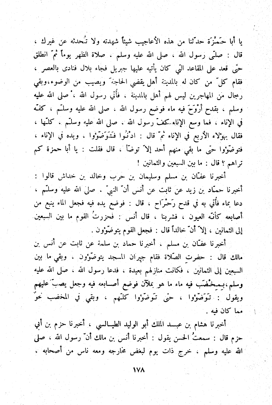 أَخْبَرَنَا عَفَّانُ بْنُ مُسْلِمٍ، وَسُلَيْمَانُ بْنُ حَرْبٍ، وَخَالِدُ بْنُ خِدَاشٍ، قَالُوا: أَخْبَرَنَا حَمَّادُ بْنُ زَيْدٍ، عَنْ ثَابِتٍ، عَنْ أَنَسٍ، أَنَّ النَّبِيَّ صلّى الله عليه وسلم دَعَا بِمَاءٍ فَأُتِيَ بِهِ فِي قَدَحٍ رَحْرَاحٍ قَالَ: §فَوَضَعَ يَدَهُ فِيهِ، فَجَعَلَ الْمَاءُ يَنْبُعُ مِنْ أَصَابِعِهِ كَأَنَّهُ الْعُيُونُ، فَشَرِبْنَا، قَالَ أَنَسٌ: فَحَزَرْتُ الْقَوْمَ مَا بَيْنَ السَّبْعِينَ إِلَى الثَّمَانِينَ إِلَّا أَنَّ خَالِدًا قَالَ: فَجَعَلَ الْقَوْمُ يَتَوَضَّئُونَ