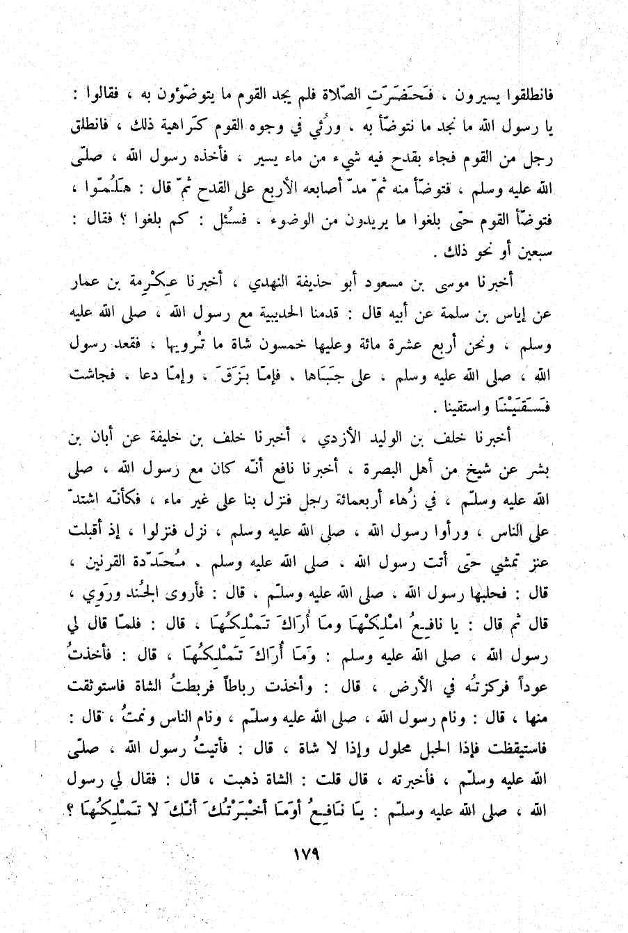 أَخْبَرَنَا مُوسَى بْنُ مَسْعُودٍ أَبُو حُذَيْفَةَ النَّهْدِيُّ، أَخْبَرَنَا عِكْرِمَةُ بْنُ عَمَّارٍ، عَنْ إِيَاسِ بْنِ سَلَمَةَ، عَنْ أَبِيهِ قَالَ: قَدِمْنَا الْحُدَيْبِيَةَ مَعَ رَسُولِ اللَّهِ صلّى الله عليه وسلم وَنَحْنُ أَرْبَعَ عَشْرَةَ مِائَةً، وَعَلَيْهَا خَمْسُونَ شَاةً مَا تُرْوِيهَا، §فَقَعَدَ رَسُولُ اللَّهِ صلّى الله عليه وسلم عَلَى جَبَاهَا، فَإِمَّا بَزَقَ، وَإِمَّا دَعَا فَجَاشَتْ فَسَقَيْنَا وَاسْتَقَيْنَا
