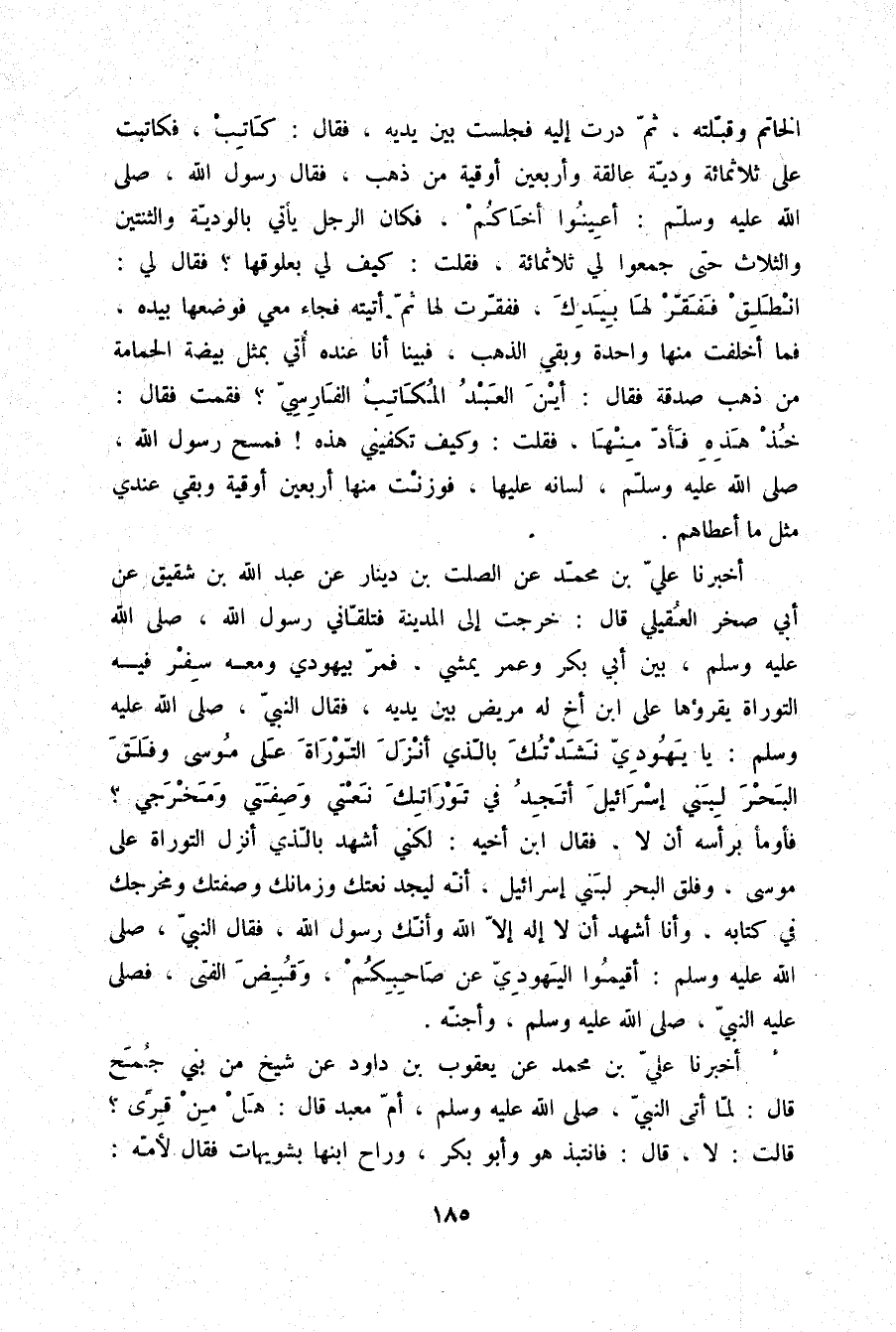 أَخْبَرَنَا عَلِيُّ بْنُ مُحَمَّدٍ، عَنِ الصَّلْتِ بْنِ دِينَارٍ، عَنْ عَبْدِ اللَّهِ بْنِ شَقِيقٍ، عَنْ أَبِي صَخْرٍ الْعُقَيْلِيِّ قَالَ: خَرَجْتُ إِلَى الْمَدِينَةِ فَتَلَقَّانِي رَسُولُ اللَّهِ صلّى الله عليه وسلم بَيْنَ أَبِي بَكْرٍ وَعُمَرَ يَمْشِي، فَمَرَّ بِيَهُودِيٍّ وَمَعَهُ سِفْرٌ فِيهِ التَّوْرَاةُ يَقْرَؤُهَا عَلَى ابْنِ أَخٍ لَهُ مَرِيضٍ بَيْنَ يَدَيْهِ، فَقَالَ النَّبِيُّ صلّى الله عليه وسلم: «يَا يَهُودِيُّ نَشَدْتُكَ بِالَّذِي أَنْزَلَ التَّوْرَاةَ عَلَى مُوسَى وَفَلَقَ الْبَحْرَ لِبَنِي إِسْرَائِيلَ أَتَجِدُ فِي تَوْرَاتِكَ نَعْتِي وَصِفَتِي وَمَخْرَجِي؟» فَأَوْمَأَ بِرَأْسِهِ أَنْ لَا، فَقَالَ ابْنُ أَخِيهِ لَكِنِّي أَشْهَدُ بِالَّذِي أَنْزَلَ التَّوْرَاةَ عَلَى مُوسَى وَفَلَقَ الْبَحْرَ لِبَنِي إِسْرَائِيلَ إِنَّهُ لَيَجِدُ نَعْتَكَ وَزَمَانَكَ وَصِفَتَكَ وَمَخْرَجَكَ فِي كِتَابِهِ، وَأَنَا أَشْهَدُ أَنْ لَا إِلَهَ إِلَّا اللَّهُ، وَأَنَّكَ رَسُولُ اللَّهِ، فَقَالَ النَّبِيُّ صلّى الله عليه وسلم: «§أَقِيمُوا الْيَهُودِيَّ عَنْ صَاحِبِكُمْ» وَقُبِضَ الْفَتَى، فَصَلَّى عَلَيْهِ النَّبِيُّ صلّى الله عليه وسلم وَأَجَنَّهُ