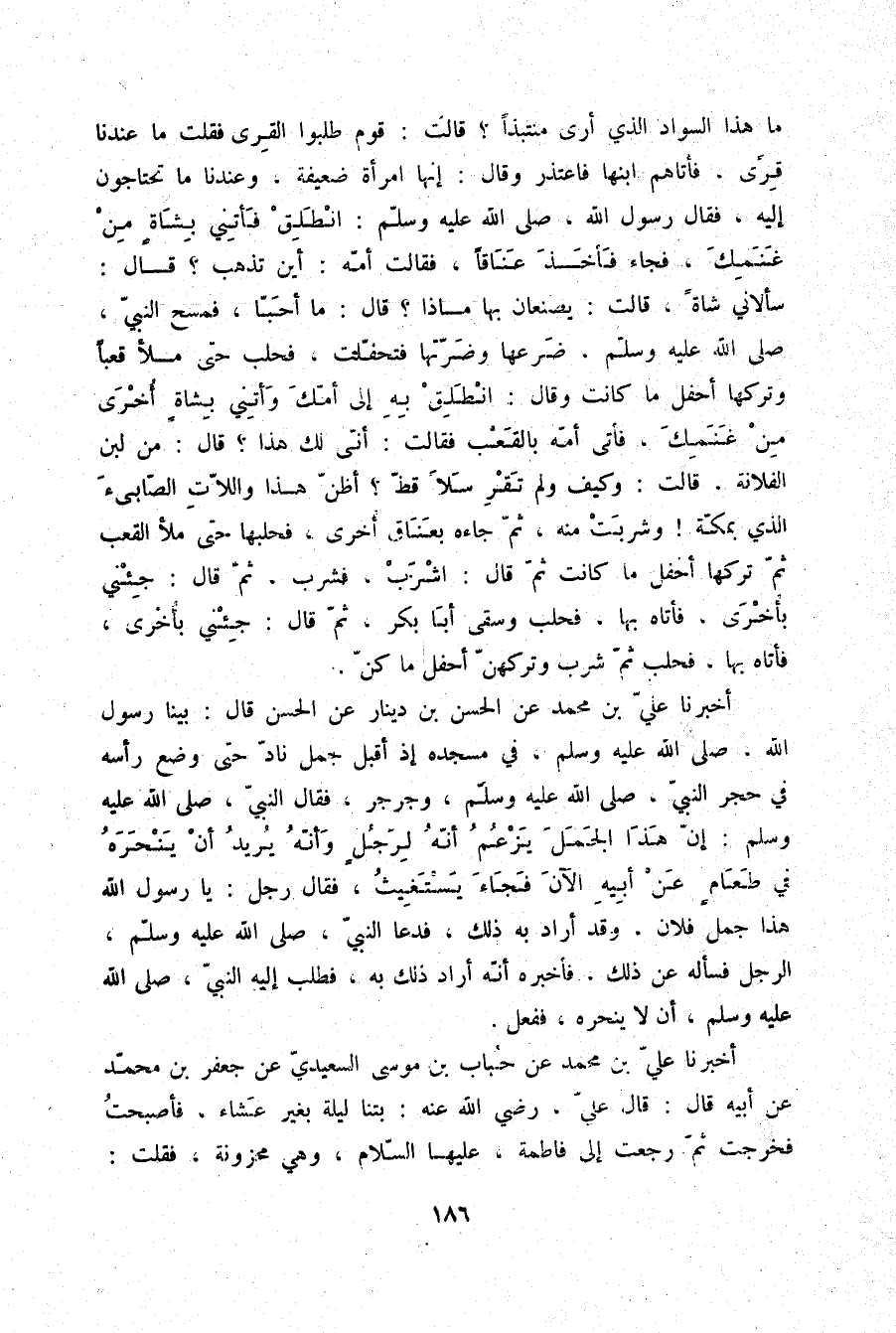 : مَا هَذَا السَّوَادُ الَّذِي أَرَى مُنْتَبِذًا؟ قَالَتْ: قَوْمٌ طَلَبُوا الْقِرَى فَقُلْتُ: مَا عِنْدَنَا قِرًى فَأَتَاهُمُ ابْنُهَا فَاعْتَذَرَ، وَقَالَ: إِنَّهَا امْرَأَةٌ ضَعِيفَةٌ، وَعِنْدَنَا مَا تَحْتَاجُونَ إِلَيْهِ، فَقَالَ رَسُولُ اللَّهِ صلّى الله عليه وسلم: «انْطَلِقْ فَأْتِنِي بِشَاةٍ مِنْ غَنَمِكَ» فَجَاءَ، فَأَخَذَ عَنَاقًا، فَقَالَتْ أُمُّهُ: أَيْنَ تَذْهَبُ؟ قَالَ: سَأَلَانِي شَاةً، قَالَتْ: يَصْنَعَانِ بِهَا مَاذَا؟ قَالَ: مَا أَحَبَّا فَمَسَحَ النَّبِيُّ صلّى الله عليه وسلم ضَرْعَهَا وَضَرَّتَهَا فَتَحَفَّلَتْ فَحَلَبَ حَتَّى مَلَأَ قَعْبًا وَتَرْكَهَا أَحْفَلَ مَا كَانَتْ، وَقَالَ: «§انْطَلِقْ بِهِ إِلَى أُمِّكَ وَأْتِنِي بِشَاةٍ أُخْرَى مِنْ غَنَمِكَ» فَأَتَى أُمَّهُ بِالْقَعْبِ، فَقَالَتْ: أَنَّى لَكَ هَذَا؟ قَالَ: مِنْ لَبَنِ الْفُلَانَةِ، قَالَتْ: وَكَيْفَ وَلَمْ تَقْرِ سَلًا قَطُّ؟ أَظُنُّ هَذَا وَاللَّاتِ الصَّابِئَ الَّذِي بِمَكَّةَ وَشَرِبَتْ مِنْهُ، ثُمَّ جَاءَهُ بِعَنَاقٍ أُخْرَى، فَحَلَبَهَا حَتَّى مَلَأَ الْقَعْبِ، ثُمَّ تَرَكَهَا أَحْفَلَ مَا كَانَتْ، ثُمَّ قَالَ: «اشْرَبْ» فَشَرِبَ ثُمَّ، قَالَ: «جِئْنِي بِأُخْرَى» فَأَتَاهُ بِهَا فَحَلَبَ وَسَقَى أَبَا بَكْرٍ، ثُمَّ قَالَ: «جِئْنِي بِأُخْرَى» فَأَتَاهُ بِهَا، فَحَلَبَ ثُمَّ شَرِبَ وَتَرَكَهُنَّ أَحْفَلَ مَا كُنَّ