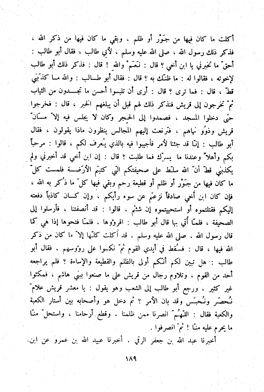 أَكَلَتْ مَا كَانَ فِيهَا مِنْ جَوْرٍ أَوْ ظُلْمٍ وَبَقِيَ مَا كَانَ فِيهَا مِنْ ذِكْرِ اللَّهِ، فَذَكَرَ ذَلِكَ رَسُولُ اللَّهِ صلّى الله عليه وسلم لِأَبِي طَالِبٍ فَقَالَ أَبُو طَالِبٍ: أَحَقٌّ مَا تُخْبِرُنِي يَا ابْنَ أَخِي؟ قَالَ: «نَعَمْ وَاللَّهِ» قَالَ: فَذَكَرَ ذَلِكَ أَبُو طَالِبٍ لِإِخْوَتِهِ، فَقَالُوا لَهُ: مَا ظَنُّكَ بِهِ، قَالَ: فَقَالَ أَبُو طَالِبٍ: وَاللَّهِ مَا كَذَبَنِي قَطُّ قَالَ: فَمَا تَرَى؟ قَالَ: أَرَى أَنْ تَلْبَسُوا أَحْسَنَ مَا تَجِدُونَ مِنَ الثِّيَابِ ثُمَّ تَخْرُجُونَ إِلَى قُرَيْشٍ فَنَذْكُرُ ذَلِكَ لَهُمْ قَبْلَ أَنْ يَبْلُغَهُمُ الْخَبَرُ، قَالَ: فَخَرَجُوا حَتَّى دَخَلُوا الْمَسْجِدَ فَصَمَدُوا إِلَى الْحِجْرِ، وَكَانَ لَا يَجْلِسُ فِيهِ إِلَّا مَسَّانُ قُرَيْشٍ وَذُوُو نُهَاهُمْ، فَتَرَفَّعَتْ إِلَيْهِمُ الْمَجَالِسُ يَنْظُرُونَ مَاذَا يَقُولُونَ؟ فَقَالَ أَبُو طَالِبٍ: إِنَّا قَدْ جِئْنَا لِأَمْرٍ فَأَجِيبُوا فِيهِ بِالَّذِي يُعْرَفُ لَكُمْ، قَالُوا: مَرْحَبًا بِكُمْ وَأَهْلًا وَعِنْدَنَا مَا يَسُرُّكَ، فَمَا طَلَبْتَ؟ قَالَ: إِنَّ ابْنَ أَخِي قَدْ أَخْبَرَنِي وَلَمُ يَكْذِبْنِي قَطُّ أَنَّ اللَّهَ سَلَّطَ عَلَى صَحِيفَتِكُمُ الَّتِي كَتَبْتُمُ الْأَرَضَةَ فَلَمَسَتْ كُلَّ مَا كَانَ فِيهَا مِنْ جَوْرٍ أَوْ ظُلْمٍ أَوْ قَطِيعَةِ رَحِمٍ، وَبَقِيَ فِيهَا كُلُّ مَا ذُكِرَ بِهِ اللَّهُ، فَإِنْ كَانَ ابْنُ أَخِي صَادِقًا نَزَعْتُمْ عَنْ سُوءِ رَأْيِكُمْ، وَإِنْ كَانَ كَاذِبًا دَفَعْتُهُ إِلَيْكُمْ فَقَتَلْتُمُوهُ أَوِ اسْتَحْيَيْتُمُوهُ إِنْ شِئْتُمْ، قَالُوا: قَدْ أَنْصَفْتَنَا فَأَرْسَلُوا إِلَى الصَّحِيفَةِ، فَلَمَّا أُتِيَ بِهَا قَالَ أَبُو طَالِبٍ: اقْرَءُوهَا، فَلَمَّا فَتَحُوهَا إِذَا هِيَ كَمَا قَالَ رَسُولُ اللَّهِ صلّى الله عليه وسلم قَدْ أُكِلَتْ كُلُّهَا إِلَّا مَا كَانَ مِنْ ذِكْرِ اللَّهِ فِيهَا، قَالَ فَسُقِطَ فِي أَيْدِي الْقَوْمِ، ثُمَّ نَكَسُوا عَلَى رُءُوسِهِمْ فَقَالَ أَبُو طَالِبٍ: هَلْ تَبَيَّنَ لَكُمْ أَنَّكُمْ أَوْلَى بِالظُّلْمِ وَالْقَطِيعَةِ وَالْإِسَاءَةِ، فَلَمْ يُرَاجِعْهُ أَحَدٌ مِنَ الْقَوْمِ وَتَلَاوَمَ رِجَالٌ مِنْ قُرَيْشٍ عَلَى مَا صَنَعُوا بِبَنِي هَاشِمٍ، فَمَكَثُوا غَيْرَ كَثِيرٍ، وَرَجَعَ أَبُو طَالِبٍ إِلَى الشِّعْبِ وَهُوَ يَقُولُ: يَا مَعْشَرَ قُرَيْشٍ عَلَامَ نُحْصَرُ وَنُحْبَسُ وَقَدْ بَانَ الْأَمْرُ، ثُمَّ دَخَلَ هُوَ وَأَصْحَابُهُ بَيْنَ أَسْتَارِ الْكَعْبَةِ وَالْكَعْبَةِ، فَقَالَ: اللَّهُمَّ §انْصُرْنَا مِمَّنْ ظَلَمَنَا، وَقَطَعَ أَرْحَامَنَا، وَاسْتَحَلَّ مِنَّا مَا يَحْرُمُ عَلَيْهِ مِنَّا، ثُمَّ انْصَرَفُوا