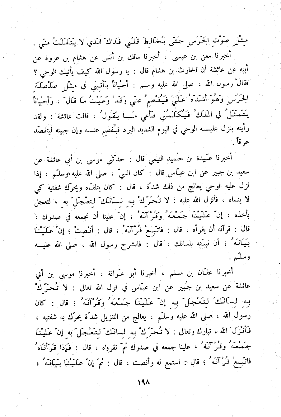 أَخْبَرَنَا عَفَّانُ بْنُ مُسْلِمٍ، أَخْبَرَنَا أَبُو عَوَانَةَ، أَخْبَرَنَا مُوسَى بْنُ أَبِي عَائِشَةَ، عَنْ سَعِيدِ بْنِ جُبَيْرٍ، عَنِ ابْنِ عَبَّاسٍ فِي قَوْلِ اللَّهِ تَعَالَى {لَا تُحَرِّكْ بِهِ لِسَانَكَ لِتَعْجَلَ بِهِ إِنَّ عَلَيْنَا جَمْعَهُ وَقُرْآنَهُ} [القيامة: 17] قَالَ: كَانَ رَسُولُ اللَّهِ صلّى الله عليه وسلم §يُعَالِجُ مِنَ التَّنْزِيلِ شِدَّةً يُحَرِّكُ بِهِ شَفَتَيْهِ، فَأَنْزَلَ اللَّهُ تَبَارَكَ وَتَعَالَى {لَا تُحَرِّكْ بِهِ لِسَانَكَ لِتَعْجَلَ بِهِ إِنَّ عَلَيْنَا جَمْعَهُ وَقُرْآنَهُ} [القيامة: 16] عَلَيْنَا جَمْعُهُ فِي صَدْرِكَ، ثُمَّ تَقْرَؤُهُ قَالَ {فَإِذَا قَرَأْنَاهُ فَاتَّبِعْ قُرْآنَهُ} [القيامة: 18] قَالَ: اسْتَمِعْ لَهُ وَأَنْصِتْ قَالَ {ثُمَّ إِنَّ عَلَيْنَا بَيَانَهُ} [القيامة: 19]