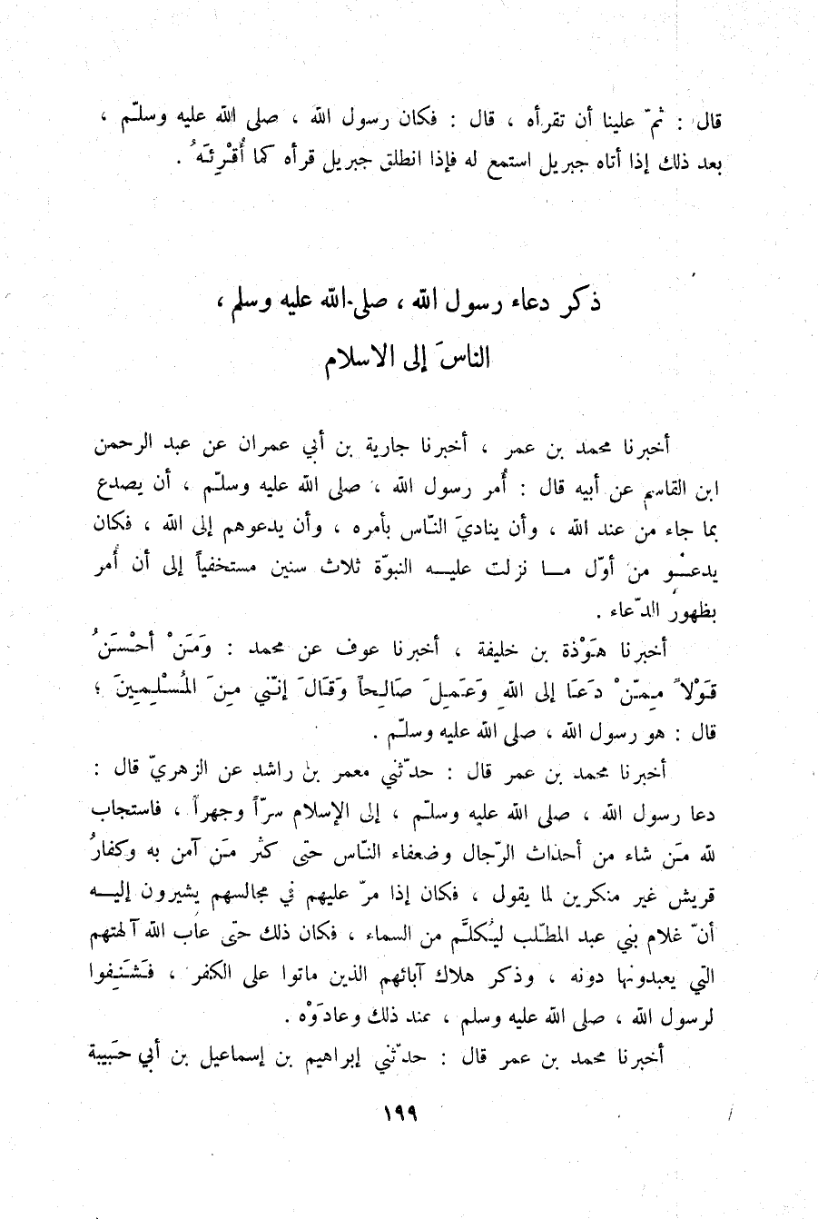 أَخْبَرَنَا مُحَمَّدُ بْنُ عُمَرَ قَالَ: حَدَّثَنِي مَعْمَرُ بْنُ رَاشِدٍ، عَنِ الزُّهْرِيِّ قَالَ: §دَعَا رَسُولُ اللَّهِ صلّى الله عليه وسلم إِلَى الْإِسْلَامِ سِرًّا وَجَهْرًا فَاسْتَجَابَ لِلَّهِ مَنْ شَاءَ مِنْ أَحْدَاثِ الرِّجَالِ وَضُعَفَاءِ النَّاسِ حَتَّى كَثُرَ مَنْ آمَنَ بِهِ، وَكُفَّارُ قُرَيْشٍ غَيْرُ مُنْكِرِينَ لِمَا يَقُولُ، فَكَانَ إِذَا مَرَّ عَلَيْهِمْ فِي مَجَالِسِهِمْ يُشِيرُونَ إِلَيْهِ أَنَّ غُلَامَ بَنِي عَبْدِ الْمُطَّلِبِ لَيُكَلَّمُ مِنَ السَّمَاءِ، فَكَانَ ذَلِكَ حَتَّى عَابَ اللَّهُ آلِهَتَهُمُ الَّتِي يَعْبُدُونَهَا دُونَهُ، وَذَكَرَ هَلَاكَ آبَائِهِمُ الَّذِينَ مَاتُوا عَلَى الْكُفْرِ فَشَنِفُوا لِرَسُولِ اللَّهِ صلّى الله عليه وسلم عِنْدَ ذَلِكَ وَعَادَوْهُ