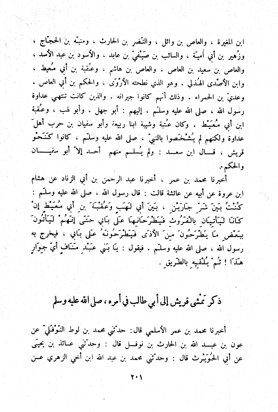 بْنِ الْمُغِيرَةِ، وَالْعَاصُ بْنُ وَائِلٍ، وَالنَّضْرُ بْنُ الْحَارِثِ، وَمُنَبِّهُ بْنُ الْحَجَّاجِ، وَزُهَيْرُ بْنُ أَبِي أُمَيَّةَ، وَالسَّائِبُ بْنُ صَيْفِيِّ بْنِ عَابِدٍ، وَالْأَسْوَدُ بْنُ عَبْدِ الْأَسَدِ، وَالْعَاصُ بْنُ سَعِيدِ بْنِ الْعَاصِ، وَالْعَاصُ بْنُ هَاشِمٍ، وَعُقْبَةُ بْنُ أَبِي مُعَيْطٍ، وَابْنُ الْأَصْدَى الْهُذَلِيُّ وَهُوَ الَّذِي نَطَحَتْهُ الْأَرْوَى، وَالْحَكَمُ بْنُ أَبِي الْعَاصِ، وَعَدِيُّ بْنُ الْحَمْرَاءِ؛ وَذَلِكَ أَنَّهُمْ كَانُوا جِيرَانَهُ، وَالَّذِينَ كَانَتْ تَنْتَهِي عَدَاوَةُ رَسُولِ اللَّهِ صلّى الله عليه وسلم إِلَيْهِمْ أَبُو جَهْلٍ، وَأَبُو لَهَبٍ، وَعُقْبَةُ بْنُ أَبِي مُعَيْطٍ، وَكَانَ عُتْبَةُ وَشَيْبَةُ ابْنَا رَبِيعَةَ، وَأَبُو سُفْيَانَ بْنُ حَرْبٍ أَهْلَ عَدَاوَةٍ، وَلَكِنَّهُمْ لَمْ يُشْخِصُوا بِالنَّبِيِّ صلّى الله عليه وسلم كَانُوا كَنَحْوِ قُرَيْشٍ، قَالَ ابْنُ سَعْدٍ: وَلَمْ يُسْلِمْ مِنْهُمْ أَحَدٌ إِلَّا أَبُو سُفْيَانَ وَالْحَكَمُ