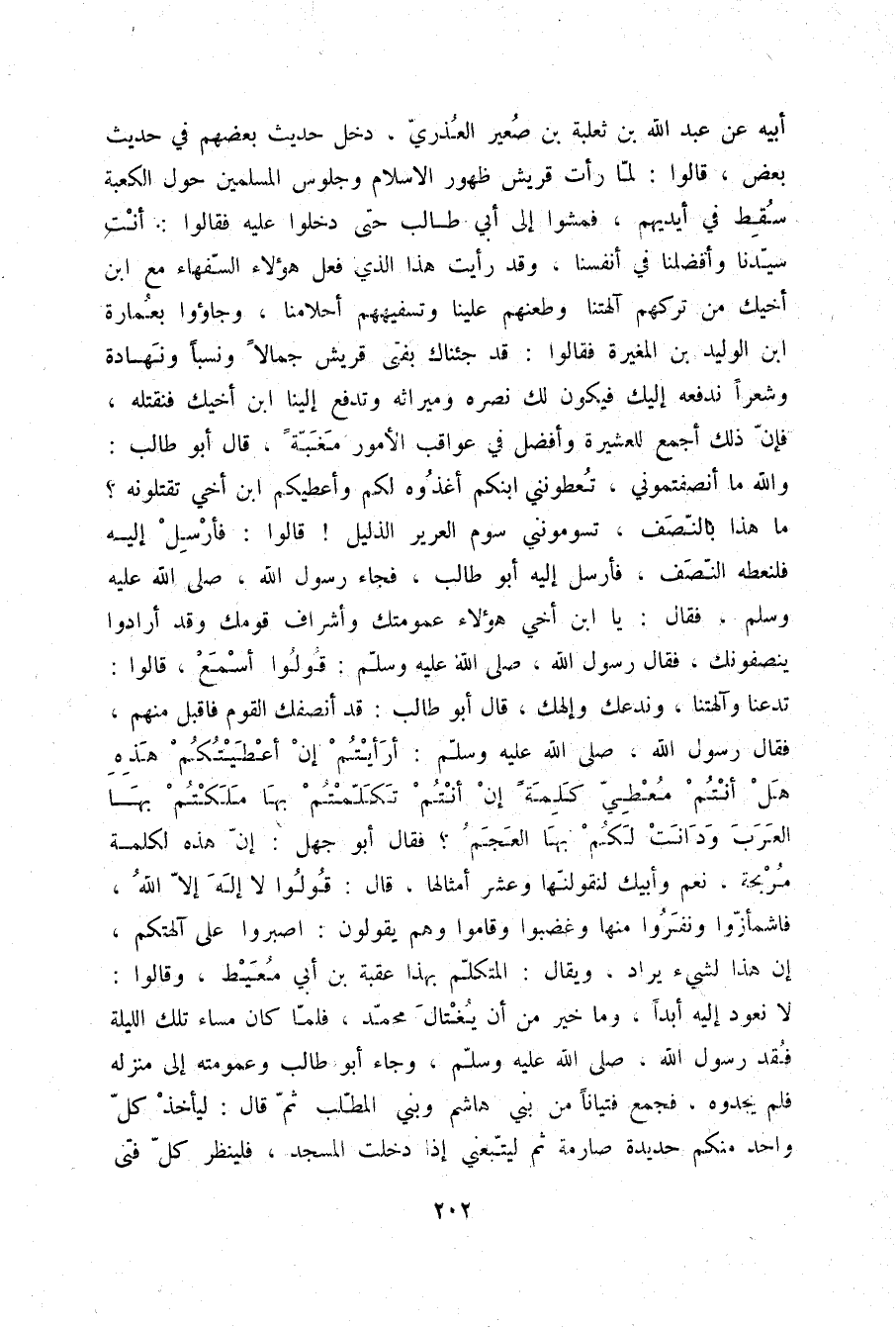 أَبِيهِ، عَنْ عَبْدِ اللَّهِ بْنِ ثَعْلَبَةَ بْنِ صُعَيْرٍ الْعُذْرِيِّ، دَخَلَ حَدِيثُ بَعْضِهِمْ فِي حَدِيثِ بَعْضٍ، قَالُوا: لَمَّا رَأَتْ قُرَيْشٌ ظُهُورَ الْإِسْلَامِ وَجُلُوسَ الْمُسْلِمِينَ حَوْلَ الْكَعْبَةِ سَقَطَ فِي أَيْدِيهِمْ فَمَشُوا إِلَى أَبِي طَالِبٍ حَتَّى دَخَلُوا عَلَيْهِ، فَقَالُوا: أَنْتَ سَيُّدُنَا وَأَفْضَلُنَا فِي أَنْفُسِنَا، وَقَدْ رَأَيْتَ هَذَا الَّذِي فَعَلَ هَؤُلَاءِ السُّفَهَاءُ مَعَ ابْنِ أَخِيكَ مِنْ تَرْكِهِمْ آلِهَتَنَا وَطَعْنِهِمْ عَلَيْنَا وَتَسْفِيهِهِمْ أَحْلَامَنَا وَجَاءُوا بِعُمَارَةَ بْنِ الْوَلِيدِ بْنِ الْمُغِيرَةِ فَقَالُوا: قَدْ جِئْنَاكَ بِفَتَى قُرَيْشٍ جَمَالًا وَنَسَبًا وَنَهَادَةً وَشِعْرًا نَدْفَعُهُ إِلَيْكَ، فَيَكُونُ لَكَ نَصَرُهُ وَمِيرَاثُهُ، وَتَدْفَعُ إِلَيْنَا ابْنَ أَخِيكَ فَنَقْتُلُهُ، فَإِنَّ ذَلِكَ أَجْمَعُ لِلْعَشِيرَةِ وَأَفْضَلُ فِي عَوَاقِبِ الْأُمُورِ مَغَبَّةً، قَالَ أَبُو طَالِبٍ: وَاللَّهِ مَا أَنْصَفْتُمُونِي تُعْطُوُنَنِي ابْنَكُمْ أَغْذُوهُ لَكُمْ وَأُعْطِيكُمُ ابْنَ أَخِي تَقْتُلُونَهُ، مَا هَذَا بِالنَّصَفِ تَسُومُونَنِي سَوْمَ الْعَرِيرِ الذَّلِيلِ، قَالُوا: فَأَرْسِلْ إِلَيْهِ فَلْنُعْطِهِ النَّصَفَ، فَأَرْسَلَ إِلَيْهِ أَبُو طَالِبٍ فَجَاءَ رَسُولُ اللَّهِ صلّى الله عليه وسلم، فَقَالَ: يَا ابْنَ أَخِي هَؤُلَاءِ عُمُومَتُكَ وَأَشْرَافُ قَوْمِكَ، وَقَدْ أَرَادُوا يُنْصِفُونَكَ، فَقَالَ رَسُولُ اللَّهِ صلّى الله عليه وسلم: «قُولُوا أَسْمَعْ» قَالُوا: تَدَعَنَا وَآلِهَتَنَا وَنَدَعُكَ وَإِلَهَكَ، قَالَ أَبُو طَالِبٍ: قَدْ أَنْصَفَكَ الْقَوْمُ فَاقْبَلْ مِنْهُمْ، فَقَالَ رَسُولُ اللَّهِ صلّى الله عليه وسلم: «§أَرَأَيْتُمْ إِنْ أَعْطَيْتُكُمْ هَذِهِ هَلْ أَنْتُمْ مُعْطِيَّ كَلِمَةً إِنْ أَنْتُمْ تَكَلَّمْتُمْ بِهَا مَلَكْتُمْ بِهَا الْعَرَبَ وَدَانَتْ لَكُمْ بِهَا الْعَجَمُ؟» فَقَالَ أَبُو جَهْلٍ: إِنَّ هَذِهِ لَكَلِمَةٌ مُرْبِحَةٌ، نَعَمْ وَأَبِيكَ لَنَقُولَنَّهَا وَعَشَرَ أَمْثَالِهَا، قَالَ: " قُولُوا: لَا إِلَهَ إِلَّا اللَّهُ " فَاشْمَأَزُّوا وَنَفَرُوا مِنْهَا وَغَضِبُوا وَقَامُوا وَهُمْ يَقُولُونَ: اصْبِرُوا عَلَى آلِهَتِكُمْ إِنَّ هَذَا لِشَيْءٌ يُرَادُ، وَيُقَالُ: الْمُتَكَلِّمُ بِهَذَا عُقْبَةُ بْنُ أَبِي مُعَيْطٍ، وَقَالُوا: لَا نَعُودُ إِلَيْهِ أَبَدًا، وَمَا خَيْرٌ مِنْ أَنْ يُغْتَالَ مُحَمَّدٌ، فَلَمَّا كَانَ مَسَاءُ تِلْكَ اللَّيْلَةِ فُقِدَ رَسُولُ اللَّهِ صلّى الله عليه وسلم، وَجَاءَ أَبُو طَالِبٍ وَعُمُومَتُهُ إِلَى مَنْزِلِهِ فَلَمْ يَجِدُوهُ، فَجَمَعَ فِتْيَانًا مِنْ بَنِي هَاشِمٍ وَبَنِي الْمُطَّلِبِ ثُمَّ قَالَ لِيَأْخُذْ كُلُّ وَاحِدٍ مِنْكُمْ حَدِيدَةً صَارِمَةً ثُمَّ لِيَتَّبِعُنِي إِذَا دَخَلْتُ الْمَسْجِدَ، فَلْيَنْظُرْ كُلُّ فَتًى
