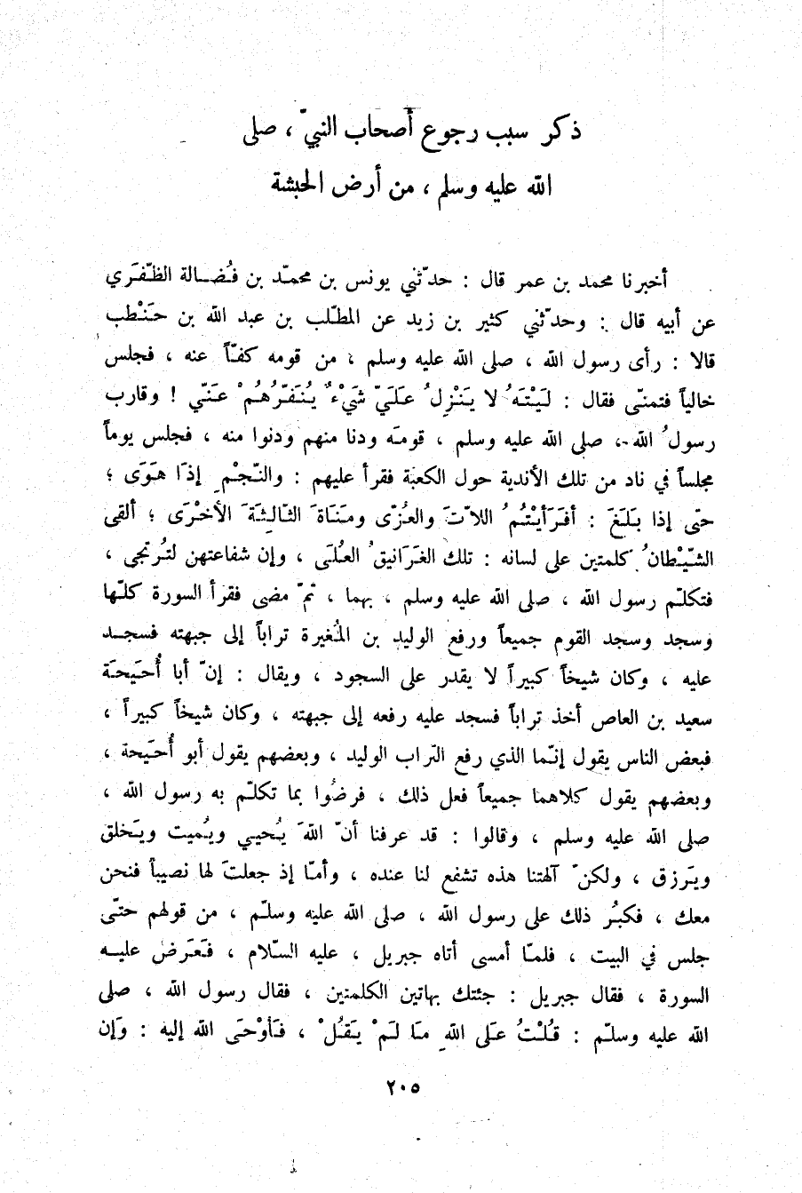 أَخْبَرَنَا مُحَمَّدُ بْنُ عُمَرَ قَالَ: حَدَّثَنِي يُونُسُ بْنُ مُحَمَّدِ بْنِ فَضَالَةَ الظَّفَرِيُّ، عَنْ أَبِيهِ قَالَ: وَحَدَّثَنِي كَثِيرُ بْنُ زَيْدٍ، عَنِ الْمُطَّلِبِ بْنِ عَبْدِ اللَّهِ بْنِ حَنْطَبٍ قَالَا: رَأَى رَسُولُ اللَّهِ صلّى الله عليه وسلم مِنْ قَوْمِهِ كَفًّا عَنْهُ، فَجَلَسَ خَالِيًا، فَتَمَنَّى فَقَالَ: «§لَيْتَهُ لَا يَنْزِلُ عَلَيَّ شَيْءٌ يُنَفِّرُهُمْ عَنِّي» وَقَارَبَ رَسُولُ اللَّهِ صلّى الله عليه وسلم قَوْمَهُ، وَدَنَا مِنْهُمْ، وَدَنَوْا مِنْهُ، فَجَلَسَ يَوْمًا مَجْلِسًا فِي نَادٍ مِنْ تِلْكَ الْأَنْدِيَةِ حَوْلَ الْكَعْبَةِ، فَقَرَأَ عَلَيْهِمْ {وَالنَّجْمِ إِذَا هَوَى} [النجم: 1] حَتَّى إِذَا بَلَغَ {أَفَرَأَيْتُمُ اللَّاتَ وَالْعُزَّى} [النجم: 19] ، {وَمَنَاةَ الثَّالِثَةَ الْأُخْرَى} [النجم: 20] أَلْقَى الشَّيْطَانُ كَلِمَتَيْنِ عَلَى لِسَانِهِ: تِلْكَ الْغَرَانِيقُ الْعُلَى، وَإِنَّ شَفَاعَتَهُنَّ لَتُرْتَجَى، فَتَكَلَّمَ رَسُولُ اللَّهِ صلّى الله عليه وسلم بِهِمَا ثُمَّ مَضَى، فَقَرَأَ السُّورَةَ كُلَّهَا وَسَجَدَ وَسَجَدَ الْقَوْمُ جَمِيعًا، وَرَفَعَ الْوَلِيدُ بْنُ الْمُغِيرَةِ تُرَابًا إِلَى جَبْهَتِهِ فَسَجَدَ عَلَيْهِ، وَكَانَ شَيْخًا كَبِيرًا لَا يَقْدِرُ عَلَى السُّجُودِ، وَيُقَالُ: إِنَّ أَبَا أُحَيْحَةَ سَعِيدَ بْنَ الْعَاصِ أَخَذَ تُرَابًا فَسَجَدَ عَلَيْهِ رَفَعَهُ إِلَى جَبْهَتِهِ وَكَانَ شَيْخًا كَبِيرًا، فَبَعْضُ النَّاسِ يَقُولُ: إِنَّمَا الَّذِي رَفَعَ التُّرَابَ الْوَلِيدُ، وَبَعْضُهُمْ يَقُولُ: أَبُو أُحَيْحَةَ، وَبَعْضُهُمْ يَقُولُ: كِلَاهُمَا جَمِيعًا فَعَلَ ذَلِكَ، فَرَضُوا بِمَا تَكَلَّمَ بِهِ رَسُولُ اللَّهِ صلّى الله عليه وسلم، وَقَالُوا: قَدْ عَرَفْنَا أَنَّ اللَّهَ يُحْيِي وَيُمِيتُ، وَيَخْلُقُ وَيَرْزُقُ، وَلَكِنَّ آلِهَتَنَا هَذِهِ تَشْفَعُ لَنَا عِنْدَهُ، وَأَمَّا إِذْ جَعَلْتَ لَهَا نَصِيبًا فَنَحْنُ مَعَكَ، فَكَبُرَ ذَلِكَ عَلَى رَسُولِ اللَّهِ صلّى الله عليه وسلم مِنْ قَوْلِهِمْ حَتَّى جَلَسَ فِي الْبَيْتِ، فَلَمَّا أَمْسَى أَتَاهُ جِبْرِيلُ عَلَيْهِ السَّلَامُ فَعَرَضَ عَلَيْهِ السُّورَةَ، فَقَالَ جِبْرِيلُ: جِئْتُكَ بِهَاتَيْنِ الْكَلِمَتَيْنِ، فَقَالَ رَسُولُ اللَّهِ صلّى الله عليه وسلم: «قُلْتُ عَلَى اللَّهِ مَا لَمْ يَقُلْ» فَأَوْحَى اللَّهُ إِلَيْهِ {وَإِنْ
