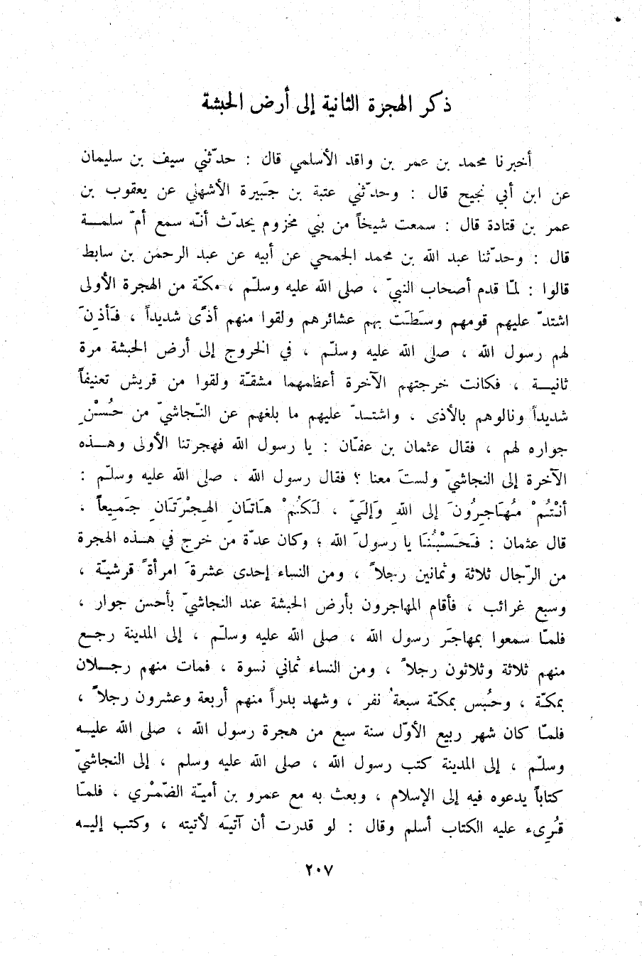 أَخْبَرَنَا مُحَمَّدُ بْنُ عُمَرَ بْنِ وَاقِدٍ الْأَسْلَمِيُّ قَالَ: حَدَّثَنِي سَيْفُ بْنُ سُلَيْمَانَ، عَنِ ابْنِ أَبِي نَجِيحٍ قَالَ: وَحَدَّثَنِي عُتْبَةُ بْنُ جَبِيرَةَ الْأَشْهَلِيُّ، عَنْ يَعْقُوبَ بْنِ عُمَرَ بْنِ قَتَادَةَ قَالَ: سَمِعْتُ شَيْخًا مِنْ بَنِي مَخْزُومٍ يُحَدِّثُ أَنَّهُ سَمِعَ أُمَّ سَلَمَةَ قَالَ: وَحَدَّثَنَا عَبْدُ اللَّهِ بْنُ مُحَمَّدٍ الْجُمَحِيُّ، عَنْ أَبِيهِ، عَنْ عَبْدِ الرَّحْمَنِ بْنِ سَابِطٍ قَالُوا: لَمَّا قَدِمَ أَصْحَابُ النَّبِيِّ صلّى الله عليه وسلم مَكَّةَ مِنَ الْهِجْرَةِ الْأُولَى اشْتَدَّ عَلَيْهِمْ قَوْمُهُمْ، وَسَطَتْ بِهِمْ عَشَائِرُهُمْ وَلَقُوا مِنْهُمْ أَذًى شَدِيدًا، فَأَذِنَ لَهُمْ رَسُولُ اللَّهِ صلّى الله عليه وسلم فِي الْخُرُوجِ إِلَى أَرْضِ الْحَبَشَةِ مَرَّةً ثَانِيَةً، فَكَانَتْ خَرْجَتُهُمُ الْآخِرَةُ أَعْظَمَهَا مَشَقَّةً، وَلَقُوا مِنْ قُرَيْشٍ تَعْنِيفًا شَدِيدًا، وَنَالُوهُمْ بِالْأَذَى وَاشْتَدَّ عَلَيْهِمْ مَا بَلَغَهُمْ عَنِ النَّجَاشِيِّ مِنْ حُسْنِ جِوَارِهِ لَهُمْ، فَقَالَ عُثْمَانُ بْنُ عَفَّانَ: يَا رَسُولَ اللَّهِ، فَهِجْرَتُنَا الْأُولَى، وَهَذِهِ الْآخِرَةُ إِلَى النَّجَاشِيِّ وَلَسْتَ مَعَنَا، فَقَالَ رَسُولُ اللَّهِ صلّى الله عليه وسلم: «§أَنْتُمْ مُهَاجِرُونَ إِلَى اللَّهِ وَإِلَيَّ، لَكُمْ هَاتَانِ الْهِجْرَتَانِ جَمِيعًا» قَالَ عُثْمَانُ: فَحَسْبُنَا يَا رَسُولَ اللَّهِ، وَكَانَ عِدَّةُ مَنْ خَرَجَ فِي هَذِهِ الْهِجْرَةِ مِنَ الرِّجَالِ ثَلَاثَةٌ وَثَمَانِينَ رَجُلًا، وَمِنَ النِّسَاءِ إِحْدَى عَشَرَةَ امْرَأَةً قُرَشِيَّةً، وَسَبْعٌ غَرَائِبُ، فَأَقَامَ الْمُهَاجِرُونَ بِأَرْضِ الْحَبَشَةِ عِنْدَ النَّجَاشِيِّ بِأَحْسَنِ جِوَارٍ، فَلَمَّا سَمِعُوا بِمُهَاجَرِ رَسُولِ اللَّهِ صلّى الله عليه وسلم إِلَى الْمَدِينَةِ، رَجَعَ مِنْهُمْ ثَلَاثَةٌ وَثَلَاثُونَ رَجُلًا، وَمِنَ النِّسَاءِ ثَمَانِي نِسْوَةٍ، فَمَاتَ مِنْهُمْ رَجُلَانِ بِمَكَّةَ، وَحُبِسَ بِمَكَّةَ سَبْعَةُ نَفَرٍ وَشَهِدَ بَدْرًا مِنْهُمْ أَرْبَعَةٌ وَعِشْرُونَ رَجُلًا، فَلَمَّا كَانَ شَهْرُ رَبِيعٍ الْأَوَّلِ سَنَةَ سَبْعٍ مِنْ هِجْرَةِ رَسُولِ اللَّهِ صلّى الله عليه وسلم إِلَى الْمَدِينَةِ كَتَبَ رَسُولُ اللَّهِ صلّى الله عليه وسلم إِلَى النَّجَاشِيِّ كِتَابًا يَدْعُوهُ فِيهِ إِلَى الْإِسْلَامِ، وَبَعَثَ بِهِ مَعَ عَمْرِو بْنِ أُمَيَّةَ الضَّمْرِيِّ، فَلَمَّا قُرِئَ عَلَيْهِ الْكِتَابُ أَسْلَمَ، وَقَالَ: لَوْ قَدَرْتُ أَنْ آتِيَهُ لَأَتَيْتُهُ، وَكَتَبَ إِلَيْهِ