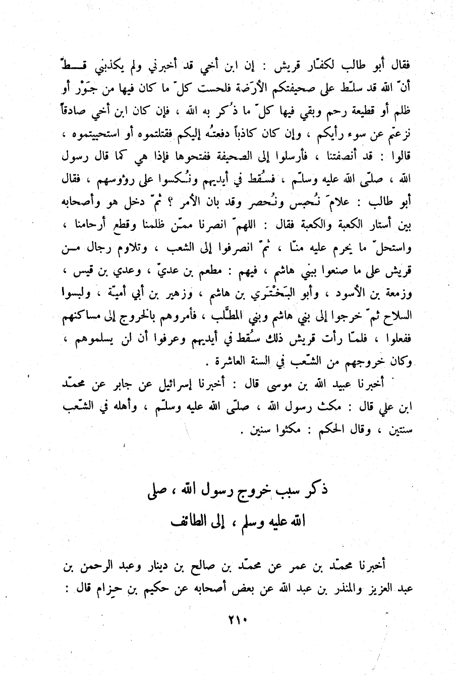، فَقَالَ أَبُو طَالِبٍ لِكُفَّارِ قُرَيْشٍ: إِنَّ ابْنَ أَخِي قَدْ أَخْبَرَنِي وَلَمُ يَكْذِبْنِي قَطُّ أَنَّ اللَّهَ قَدْ سَلَّطَ عَلَى صَحِيفَتِكُمُ الْأَرَضَةَ فَلَحَسَتْ كُلَّ مَا كَانَ فِيهَا مِنْ جَوْرٍ أَوْ ظُلْمٍ أَوْ قَطِيعَةِ رَحِمٍ وَبَقِيَ فِيهَا كُلُّ مَا ذُكِرَ بِهِ اللَّهُ، فَإِنْ كَانَ ابْنُ أَخِي صَادِقًا نَزَعْتُمْ عَنْ سُوءِ رَأْيِكُمْ، وَإِنْ كَانَ كَاذِبًا دَفَعْتُهُ إِلَيْكُمْ فَقَتَلْتُمُوهُ أَوِ اسْتَحْيَيْتُمُوهُ، قَالُوا: قَدْ أَنْصَفْتَنَا فَأَرْسَلُوا إِلَى الصَّحِيفَةِ فَفَتَحُوهَا، فَإِذَا هِيَ كَمَا قَالَ رَسُولُ اللَّهِ صلّى الله عليه وسلم فَسَقَطَ فِي أَيْدِيهِمْ، وَنَكَسُوا عَلَى رُءُوسِهِمْ، فَقَالَ أَبُو طَالِبٍ: عَلَامَ نُحْبَسُ وَنُحْصَرُ وَقَدْ بَانَ الْأَمْرُ، ثُمَّ دَخَلَ هُوَ وَأَصْحَابُهُ بَيْنَ أَسْتَارِ الْكَعْبَةِ وَالْكَعْبَةِ، فَقَالَ: اللَّهُمَّ انْصُرْنَا مِمَّنْ ظَلَمَنَا، وَقَطَعَ أَرْحَامَنَا، وَاسْتَحَلَّ مَا يَحْرُمُ عَلَيْهِ مِنَّا، ثُمَّ انْصَرَفُوا إِلَى الشِّعْبِ، وَتَلَاوَمَ رِجَالٌ مِنْ قُرَيْشٍ عَلَى مَا صَنَعُوا بِبَنِي هَاشِمٍ، فِيهِمْ مُطْعِمُ بْنُ عَدِيٍّ، وَعَدِيُّ بْنُ قَيْسٍ، وَزَمْعَةُ بْنُ الْأَسْوَدِ، وَأَبُو الْبَحْتَرِيِّ بْنُ هَاشِمٍ، وَزُهَيْرُ بْنُ أَبِي أُمَيَّةَ، وَلَبِسُوا السِّلَاحَ، ثُمَّ خَرَجُوا إِلَى بَنِي هَاشِمٍ وَبَنِي الْمُطَّلِبِ، فَأَمَرُوهُمْ بِالْخُرُوجِ إِلَى مَسَاكِنِهِمْ، فَفَعَلُوا، فَلَمَّا رَأَتْ قُرَيْشٌ ذَلِكَ سُقِطَ فِي أَيْدِيهِمْ، وَعَرَفُوا أَنْ لَنْ يُسْلِمُوهُمْ، وَكَانَ خُرُوجُهُمْ مِنَ الشِّعْبِ فِي السَّنَةِ الْعَاشِرَةِ