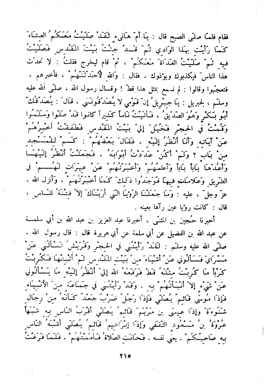 أَخْبَرَنَا حُجَيْنُ بْنُ الْمُثَنَّى، أَخْبَرَنَا عَبْدُ الْعَزِيزِ بْنُ عَبْدِ اللَّهِ بْنِ أَبِي سَلَمَةَ، عَنْ عَبْدِ اللَّهِ بْنِ الْفُضَيْلِ، عَنْ أَبِي سَلَمَةَ، عَنْ أَبِي هُرَيْرَةَ قَالَ: قَالَ رَسُولُ اللَّهِ صلّى الله عليه وسلم: " لَقَدْ §رَأَيْتُنِي فِي الْحِجْرِ وَقُرَيْشٌ تَسْأَلُنِي عَنْ مَسْرَايَ فَسَأَلُونِي عَنْ أَشْيَاءَ مِنْ بَيْتِ الْمَقْدِسِ لَمْ أُثْبِتْهَا فَكُرِبْتُ كَرْبًا مَا كُرِبْتُ مِثْلَهُ قَطُّ، فَرَفَعَهُ اللَّهُ إِلَيَّ أَنْظُرُ إِلَيْهِ مَا يَسْأَلُونِي عَنْ شَيْءٍ إِلَّا أَنْبَأْتُهُمْ بِهِ، وَقَدْ رَأَيْتُنِي فِي جَمَاعَةٍ مِنَ الْأَنْبِيَاءِ، فَإِذَا مُوسَى قَائِمٌ يُصَلِّي، فَإِذَا رَجُلٌ ضَرِبٌ جَعْدٌ كَأَنَّهُ مِنْ رِجَالِ شَنُوءَةَ، وَإِذَا عِيسَى ابْنُ مَرْيَمَ قَائِمٌ يُصَلِّي أَقْرَبُ النَّاسِ بِهِ شَبَهًا عُرْوَةُ بْنُ مَسْعُودٍ الثَّقَفِيُّ، وَإِذَا إِبْرَاهِيمُ قَائِمٌ يُصَلِّي أَشْبَهُ النَّاسِ بِهِ صَاحِبُكُمْ يَعْنِي نَفْسَهُ، فَحَانَتِ الصَّلَاةُ فَأَمَمْتُهُمْ، فَلَمَّا فَرَغْتُ -[216]- مِنَ الصَّلَاةِ، قَالَ لِي قَائِلٌ: يَا مُحَمَّدُ، هَذَا مَالِكٌ صَاحِبُ النَّارِ، فَسَلِّمْ عَلَيْهِ، فَالْتَفَتُّ إِلَيْهِ فَبَدَأَنِي بِالسَّلَامِ