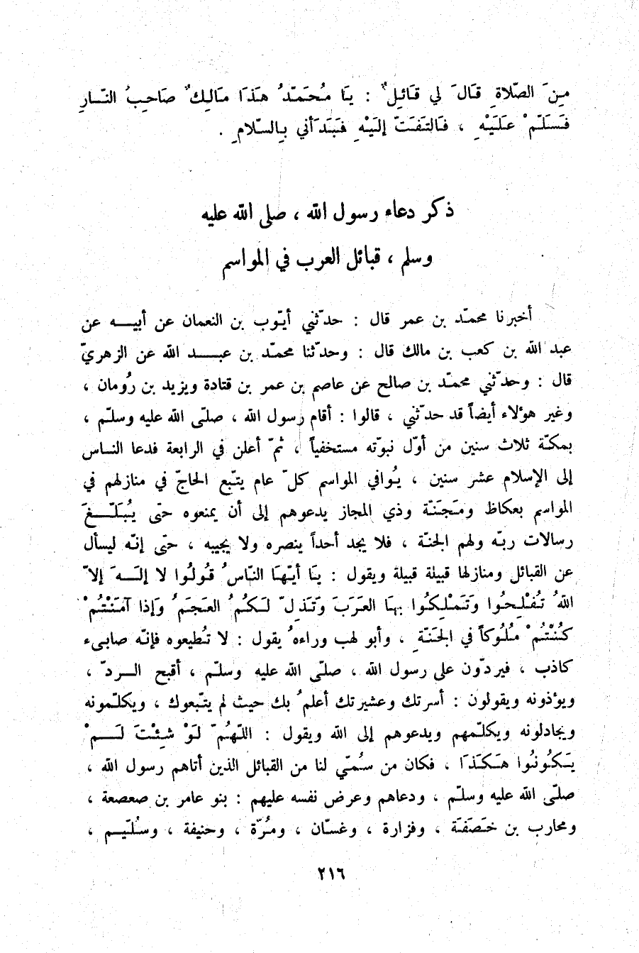 أَخْبَرَنَا مُحَمَّدُ بْنُ عُمَرَ قَالَ: حَدَّثَنِي أَيُّوبُ بْنُ النُّعْمَانِ، عَنْ أَبِيهِ، عَنْ عَبْدِ اللَّهِ بْنِ كَعْبِ بْنِ مَالِكٍ قَالَ: وَحَدَّثَنَا مُحَمَّدُ بْنُ عَبْدِ اللَّهِ، عَنِ الزُّهْرِيِّ قَالَ: وَحَدَّثَنِي مُحَمَّدُ بْنُ صَالِحٍ، عَنْ عَاصِمِ بْنِ عُمَرَ بْنِ قَتَادَةَ، وَيَزِيدَ بْنِ رُومَانَ وَغَيْرِ هَؤُلَاءِ أَيْضًا قَدْ حَدَّثَنِي، قَالُوا: أَقَامَ رَسُولُ اللَّهِ صلّى الله عليه وسلم بِمَكَّةَ ثَلَاثَ سِنِينَ مِنْ أَوَّلِ نُبُوَّتِهِ مُسْتَخْفِيًا، ثُمَّ أَعْلَنَ فِي الرَّابِعَةِ، فَدَعَا النَّاسَ إِلَى الْإِسْلَامِ عَشْرَ سِنِينَ يُوَافِي الْمَوَاسِمَ كُلَّ عَامٍ يَتَّبِعُ الْحَاجَّ فِي مَنَازِلِهِمْ فِي الْمَوَاسِمِ بِعُكَاظٍ وَمَجَنَّةَ وَذِي الْمَجَازِ يَدْعُوهُمْ إِلَى أَنْ يَمْنَعُوهُ حَتَّى يُبَلِّغَ رِسَالَاتِ رَبِّهِ وَلَهُمُ الْجَنَّةُ، فَلَا يَجِدُ أَحَدًا يَنْصُرُهُ وَلَا يُجِيبُهُ، حَتَّى إِنَّهُ لَيَسْأَلُ عَنِ الْقَبَائِلِ وَمَنَازِلِهَا قَبِيلَةً قَبِيلَةً، وَيَقُولُ: " يَا أَيُّهَا النَّاسُ، §قُولُوا: لَا إِلَهَ إِلَّا اللَّهُ تُفْلِحُوا وَتَمْلِكُوا بِهَا الْعَرَبَ، وَتَذِلَّ لَكُمُ الْعَجَمُ، وَإِذَا آمَنْتُمْ كُنْتُمْ مُلُوكًا فِي الْجَنَّةِ " وَأَبُو لَهَبٍ وَرَاءَهُ يَقُولُ: لَا تُطِيعُوهُ، فَإِنَّهُ صَابِئٌ كَاذِبٌ فَيَرُدُّونَ عَلَى رَسُولِ اللَّهِ صلّى الله عليه وسلم أَقْبَحَ الرَّدِّ وَيُؤْذُونَهُ وَيَقُولُونَ: أُسْرَتُكَ وَعَشِيرَتُكَ أَعْلَمُ بِكَ، حَيْثُ لَمْ يَتَّبِعُوكَ وَيُكَلِّمُونَهُ وَيُجَادِلُونَهُ وَيُكَلِّمُهُمْ، وَيَدْعُوهُمْ إِلَى اللَّهِ، وَيَقُولُ: «اللَّهُمَّ لَوْ شِئْتَ لَمْ يَكُونُوا هَكَذَا» فَكَانَ مَنْ سُمِّيَ لَنَا مِنَ الْقَبَائِلِ الَّذِينَ أَتَاهُمْ رَسُولُ اللَّهِ صلّى الله عليه وسلم وَدَعَاهُمْ وَعَرَضَ نَفْسَهُ عَلَيْهِمْ: بَنُو عَامِرِ بْنِ صَعْصَعَةَ، وَمُحَارِبُ بْنُ خَصَفَةَ، وَفَزَارَةُ، وَغَسَّانُ، وَمُرَّةُ، وَحَنِيفَةُ، وَسُلَيْمٌ