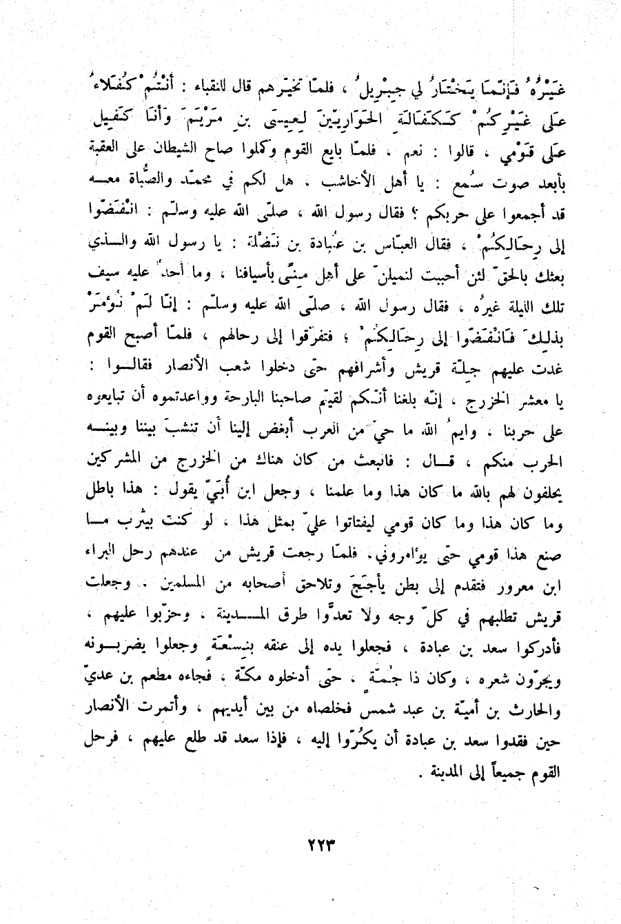 غَيْرُهُ، فَإِنَّمَا يَخْتَارُ لِي جِبْرِيلُ» فَلَمَّا تَخَيَّرَهُمْ، قَالَ لِلنُّقَبَاءِ: «أَنْتُمْ كُفَلَاءُ عَلَى غَيْرِكُمْ كَكَفَالَةِ الْحَوَارِيِّينَ لِعِيسَى ابْنِ مَرْيَمَ، وَأَنَا كَفِيلٌ عَلَى قَوْمِي» قَالُوا: نَعَمْ، فَلَمَّا بَايَعَ الْقَوْمَ وَكَمَلُوا صَاحَ الشَّيْطَانُ عَلَى الْعَقَبَةِ بِأَبْعَدِ صَوْتٍ سُمِعَ: يَا أَهْلَ الْأَخَاشِبِ، هَلْ لَكُمْ فِي مُحَمَّدٍ وَالصُّبَاةِ مَعَهُ، قَدْ أَجْمَعُوا عَلَى حَرْبِكُمْ، فَقَالَ رَسُولُ اللَّهِ صلّى الله عليه وسلم: «انْفَضُّوا إِلَى رِحَالِكُمْ» فَقَالَ الْعَبَّاسُ بْنُ عُبَادَةَ بْنِ نَضْلَةَ: يَا رَسُولَ اللَّهِ، وَالَّذِي بَعَثَكَ بِالْحَقِّ لَئِنْ أَحْبَبْتَ لَنَمِيلَنَّ عَلَى أَهْلِ مِنًى بِأَسْيَافِنَا، وَمَا أَحَدٌ عَلَيْهِ سَيْفٌ تِلْكَ اللَّيْلَةَ غَيْرُهُ، فَقَالَ رَسُولُ اللَّهِ صلّى الله عليه وسلم: «إِنَّا لَمْ نُؤْمَرْ بِذَلِكَ فَانْفَضُّوا إِلَى رِحَالِكُمْ» فَتَفَرَّقُوا إِلَى رِحَالِهِمْ، فَلَمَّا أَصْبَحَ الْقَوْمُ غَدَتْ عَلَيْهِمْ جُلَّةُ قُرَيْشٍ وَأَشْرَافُهُمْ حَتَّى دَخَلُوا شِعْبَ الْأَنْصَارِ، فَقَالُوا: يَا مَعْشَرَ الْخَزْرَجِ إِنَّهُ بَلَغَنَا أَنَّكُمْ لَقِيتُمْ صَاحِبَنَا الْبَارِحَةَ، وَوَاعَدْتُمُوهُ أَنْ تُبَايِعُوهُ عَلَى حَرْبِنَا وَايْمُ اللَّهِ، مَا حَيٌّ مِنَ الْعَرَبِ أَبْغَضُ إِلَيْنَا أَنْ تَنْشَبَ بَيْنَنَا وَبَيْنَهُ الْحَرْبُ مِنْكُمْ، قَالَ: فَانْبَعَثَ مَنْ كَانَ هُنَاكَ مِنَ الْخَزْرَجِ مِنَ الْمُشْرِكِينَ يَحْلِفُونَ لَهُمْ بِاللَّهِ مَا كَانَ هَذَا، وَمَا عَلِمْنَا، وَجَعَلَ ابْنُ أُبَيٍّ يَقُولُ: هَذَا بَاطِلٌ، وَمَا كَانَ هَذَا، وَمَا كَانَ قَوْمِي لِيَفْتَاتُوا عَلَيَّ بِمِثْلِ هَذَا لَوْ كُنْتُ بِيَثْرِبَ مَا صَنَعَ هَذَا قَوْمِي حَتَّى يُؤَامِرُونِي، فَلَمَّا رَجَعَتْ قُرَيْشٌ مِنْ عِنْدِهِمْ رَحَلَ الْبَرَاءُ بْنُ مَعْرُورٍ فَتَقَدَّمَ إِلَى بَطْنِ يَأْجَجَ وَتَلَاحَقَ أَصْحَابُهُ مِنَ الْمُسْلِمِينَ، وَجَعَلَتْ قُرَيْشٌ تَطْلُبُهُمْ فِي كُلِّ وَجْهٍ وَلَا تَعَدَّوْا طُرُقَ الْمَدِينَةِ وَحَزَّبُوا عَلَيْهِمْ، فَأَدْرَكُوا سَعْدَ بْنَ عُبَادَةَ، فَجَعَلُوا يَدَهُ إِلَى عُنُقِهِ بِنِسْعَةٍ وَجَعَلُوا يَضْرِبُونَهُ وَيَجُرُّونَ شَعْرَهُ، وَكَانَ ذَا جُمَّةٍ، حَتَّى أَدْخَلُوهُ مَكَّةَ، فَجَاءَهُ مُطْعِمُ بْنُ عَدِيٍّ وَالْحَارِثُ بْنُ أُمَيَّةَ بْنِ عَبْدِ شَمْسٍ فَخَلَّصَاهُ مِنْ بَيْنِ أَيْدِيهِمْ وَأَتَمَرَتِ الْأَنْصَارُ حِينَ فَقَدُوا سَعْدَ بْنَ عُبَادَةَ أَنْ يَكُرُّوا إِلَيْهِ، فَإِذَا سَعْدٌ قَدْ طَلَعَ عَلَيْهِمْ فَرَحَلَ الْقَوْمُ جَمِيعًا إِلَى الْمَدِينَةِ
