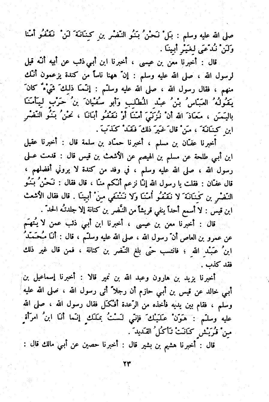 قَالَ: أَخْبَرَنَا مَعْنُ بْنُ عِيسَى، أَخْبَرَنَا ابْنُ أَبِي ذِئْبٍ، عَمَّنْ لَا يُتَّهَمُ عَنْ عَمْرِو بْنِ الْعَاصِ، أَنَّ رَسُولَ اللَّهِ صلّى الله عليه وسلم قَالَ: «§أَنَا مُحَمَّدُ بْنُ عَبْدِ اللَّهِ فَانْتَسَبَ حَتَّى بَلَغَ النَّضْرَ بْنَ كِنَانَةَ فَمَنْ قَالَ غَيْرَ ذَلِكَ فَقَدْ كَذَبَ»