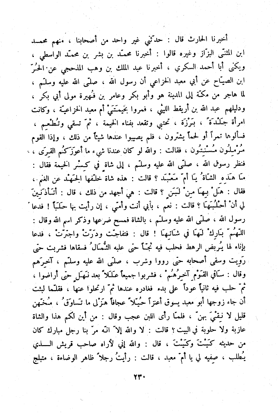 أَخْبَرَنَا الْحَارِثُ قَالَ: حَدَّثَنِي غَيْرُ وَاحِدٍ مِنْ أَصْحَابِنَا مِنْهُمْ مُحَمَّدُ بْنُ الْمُثَنَّى الْبَزَّازُ وَغَيْرُهُ، قَالُوا: أَخْبَرَنَا مُحَمَّدُ بْنُ بِشْرِ بْنِ مُحَمَّدٍ الْوَاسِطِيُّ، وَيُكَنَّى أَبَا أَحْمَدَ السُّكَّرِيَّ، أَخْبَرَنَا عَبْدُ الْمَلِكِ بْنُ وَهْبٍ الْمَذْحِجِيُّ، عَنِ الْحُرِّ بْنِ الصَّيَّاحِ، عَنْ أَبِي مَعْبَدٍ الْخُزَاعِيِّ أَنَّ رَسُولَ اللَّهِ صلّى الله عليه وسلم لَمَّا هَاجَرَ مِنْ مَكَّةَ إِلَى الْمَدِينَةِ هُوَ وَأَبُو بَكْرٍ وَعَامِرُ بْنُ فُهَيْرَةَ مَوْلَى أَبِي بَكْرٍ، وَدَلِيلُهُمْ عَبْدُ اللَّهِ بْنُ أُرَيْقِطٍ اللَّيْثِيُّ فَمَرُّوا بِخَيْمَتَيْ أُمِّ مَعْبَدٍ الْخُزَاعِيَّةِ، وَكَانَتِ امْرَأَةً جَلْدَةً بَرْزَةً تَحْتَبِي وَتَقْعُدُ بِفِنَاءِ الْخَيْمَةِ، ثُمَّ تَسْقِي وَتُطْعِمُ، فَسَأَلُوهَا تَمْرًا أَوْ لَحْمًا يَشْتَرُونَ فَلَمْ يُصِيبُوا عِنْدَهَا شَيْئًا مِنْ ذَلِكَ، وَإِذَا الْقَوْمُ مُرْمِلُونَ مُسْنِتُونَ، فَقَالَتْ: وَاللَّهِ لَوْ كَانَ عِنْدَنَا شَيْءٌ مَا أَعْوَزَكُمُ الْقِرَى، فَنَظَرَ رَسُولُ اللَّهِ صلّى الله عليه وسلم إِلَى شَاةٍ فِي كَسْرِ الْخَيْمَةِ، فَقَالَ: «مَا هَذِهِ الشَّاةُ يَا أُمَّ مَعْبَدٍ؟» قَالَتْ: هَذِهِ شَاةٌ خَلَّفَهَا الْجَهْدُ عَنِ الْغَنَمِ، فَقَالَ: «هَلْ بِهَا مِنْ لَبَنٍ؟» قَالَتْ: هِيَ أَجْهَدُ مِنْ ذَلِكَ، قَالَ: «أَتَأْذَنِينَ لِي أَنْ أَحْلِبَهَا؟» قَالَتْ: نَعَمْ بِأَبِي أَنْتَ وَأُمِّي إِنْ رَأَيْتَ بِهَا حَلْبًا، فَدَعَا رَسُولُ اللَّهِ صلّى الله عليه وسلم بِالشَّاةِ فَمَسَحَ ضَرْعَهَا وَذَكَرَ اسْمَ اللَّهِ، وَقَالَ: «اللَّهُمَّ بَارِكْ لَهَا فِي شَاتِهَا» قَالَ: فَتَفَاجَتْ وَدَرَّتْ وَاجْتَرَّتْ فَدَعَا بِإِنَاءٍ لَهَا يَرْبِضُ الرَّهْطَ فَحَلَبَ فِيهِ ثَجًّا حَتَّى عُلْبَةِ الثُّمَالِ فَسَقَاهَا فَشَرِبَتْ حَتَّى رَوَيَتْ، وَسَقَى أَصْحَابَهُ حَتَّى رَوَوْا وَشَرِبَ صلّى الله عليه وسلم آخِرَهُمْ، وَقَالَ: «§سَاقِي الْقَوْمِ آخِرُهُمْ» فَشَرِبُوا جَمِيعًا عَلَلًا بَعْدَ نَهَلٍ حَتَّى أَرَاضُوا ثُمَّ حَلَبَ فِيهِ ثَانِيًا عَوْدًا عَلَى بَدْءٍ فَغَادَرَهُ عِنْدَهَا، ثُمَّ ارْتَحُلُوا عَنْهَا، فَقَلَّمَا لَبَثَتْ أَنْ جَاءَ زَوْجُهَا أَبُو مَعْبَدٍ يَسُوقُ أَعْنُزًا حِيَالًا عِجَافٌا هَزْلَى مَا تُسَاوَقُ مُخُّهُنَّ قَلِيلٌ، لَا نِقْيَ بِهِنَّ، فَلَمَّا رَأَى اللَّبَنَ عَجِبَ، وَقَالَ: مِنْ أَيْنَ لَكُمْ هَذَا وَالشَّاةُ عَازِبَةٌ وَلَا حَلُوبَةَ فِي الْبَيْتِ؟ قَالَتْ: لَا وَاللَّهِ إِلَّا أَنَّهُ مَرَّ بِنَا رَجُلٌ مُبَارَكٌ كَانَ مِنْ حَدِيثِهِ: كَيْتَ وَكَيْتَ قَالَ: وَاللَّهِ إِنِّي لَأَرَاهُ صَاحِبَ قُرَيْشٍ الَّذِي يُطْلَبُ، صِفِيهِ لِي يَا أُمَّ مَعْبَدٍ، قَالَتْ: رَأَيْتُ رَجُلًا ظَاهِرَ الْوَضَاءَةِ، مُتَبَلِّجَ