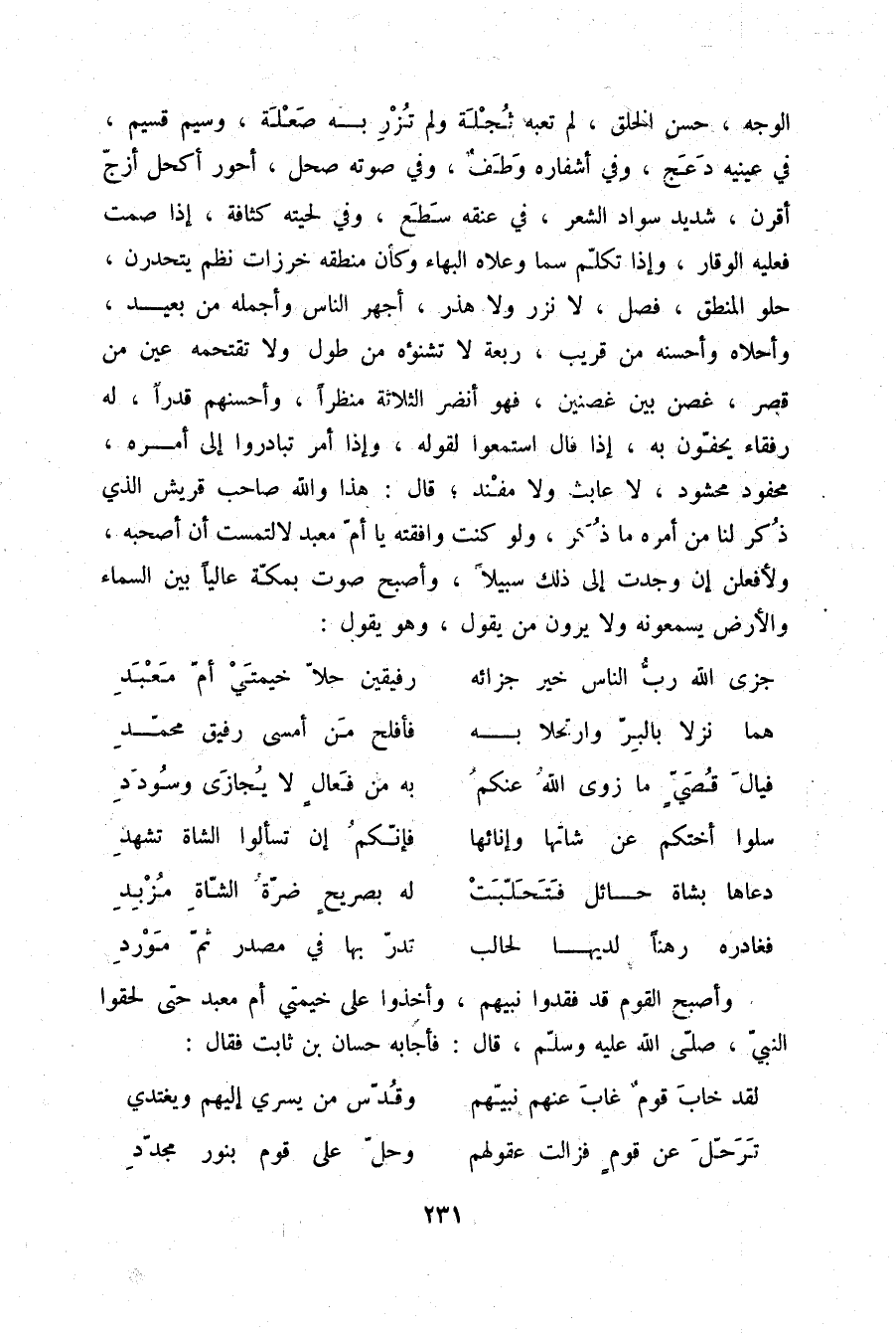 جَزَى اللَّهُ رَبُّ النَّاسِ خَيْرَ جَزَائِهِ ... رَفِيقَيْنِ حَلَّا خَيْمَتَيْ أَمِّ مَعْبَدِ