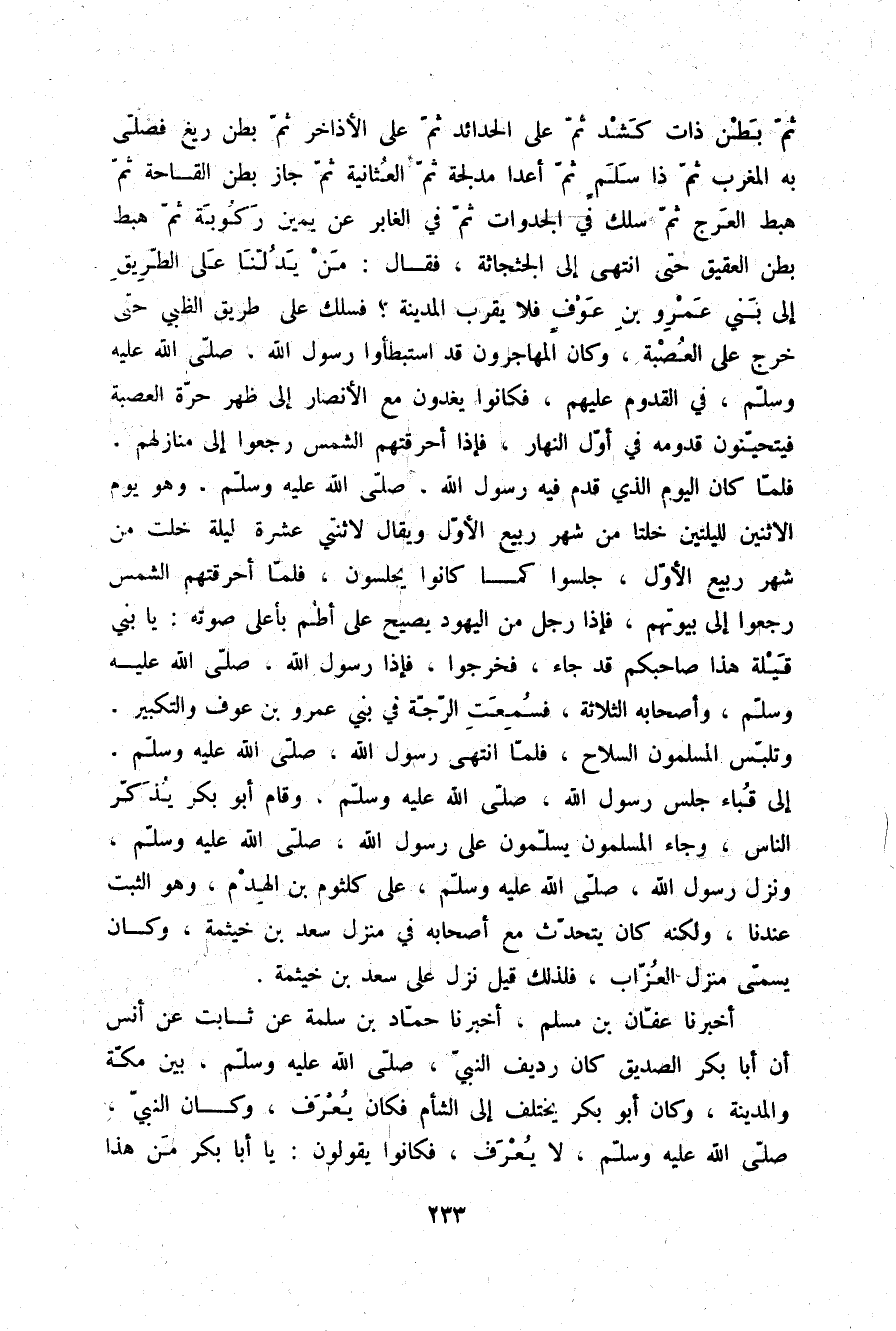 ، ثُمَّ بَطْنَ ذَاتِ كَشْدٍ، ثُمَّ عَلَا الْحَدَائِدَ، ثُمَّ عَلَا الْأَذَاخِرَ، ثُمَّ بَطْنَ رِيغٍ، فَصَلَّى بِهِ الْمَغْرِبَ، ثُمَّ ذَا سَلَمٍ، ثُمَّ عَدَا مَدْلَجَةَ، ثُمَّ الْعُثَانيَّةَ، ثُمَّ جَازَ بَطْنَ الْقَاحَةِ، ثُمَّ هَبَطَ الْعَرْجَ، ثُمَّ سَلَكَ فِي الْجَدَوَاتِ، ثُمَّ فِي الْغَابِرِ عَنْ يَمِينِ رَكُوبَةَ، ثُمَّ هَبَطَ بَطْنَ الْعَقِيقِ حَتَّى انْتَهَى إِلَى الْجِثْجَاثَةِ، فَقَالَ: «مَنْ يَدُلُّنَا عَلَى الطَّرِيقِ إِلَى بَنِي عَمْرِو بْنِ عَوْفٍ فَلَا يَقْرَبِ الْمَدِينَةَ؟» فَسَلَكَ عَلَى طَرِيقِ الظَّبْيِ حَتَّى خَرَجَ عَلَى الْعُصْبَةِ، وَكَانَ الْمُهَاجِرُونَ قَدِ اسْتَبْطَئُوا رَسُولَ اللَّهِ صلّى الله عليه وسلم فِي الْقُدُومِ عَلَيْهِمْ، فَكَانُوا يَغْدُونَ مَعَ الْأَنْصَارِ إِلَى ظَهْرِ حَرَّةِ الْعُصْبَةِ فَيَتَحَيَّنُونَ قُدُومَهُ فِي أَوَّلِ النَّهَارِ، فَإِذَا أَحْرَقَتْهُمُ الشَّمْسُ رَجَعُوا إِلَى مَنَازِلِهِمْ، فَلَمَّا كَانَ الْيَوْمُ الَّذِي قَدِمَ فِيهِ رَسُولُ اللَّهِ صلّى الله عليه وسلم وَهُوَ يَوْمُ الِاثْنَيْنِ لِلَيْلَتَيْنِ خَلَتَا مِنْ شَهْرِ رَبِيعٍ الْأَوَّلِ، وَيُقَالُ لِاثْنَتَيْ عَشْرَةَ لَيْلَةً خَلَتْ مِنْ شَهْرِ رَبِيعٍ الْأَوَّلِ، جَلَسُوا كَمَا كَانُوا يَجْلِسُونَ، فَلَمَّا أَحْرَقَتْهُمُ الشَّمْسُ رَجَعُوا إِلَى بُيُوتِهِمْ، فَإِذَا رَجُلٌ مِنَ الْيَهُودِ يَصِيحُ عَلَى أُطُمٍ بِأَعْلَى صَوْتِهِ يَا بَنِي قَيْلَةَ: هَذَا صَاحِبَكُمْ قَدْ جَاءَ فَخَرَجُوا، فَإِذَا رَسُولُ اللَّهِ صلّى الله عليه وسلم وَأَصْحَابُهُ الثَّلَاثَةُ، فَسُمِعَتِ الرَّجَّةُ فِي بَنِي عَمْرِو بْنِ عَوْفٍ وَالتَّكْبِيرُ وَتَلَبَّسَ الْمُسْلِمُونَ السِّلَاحَ، فَلَمَّا انْتَهَى رَسُولُ اللَّهِ صلّى الله عليه وسلم إِلَى قُبَاءَ جَلَسَ رَسُولُ اللَّهِ صلّى الله عليه وسلم، وَقَامَ أَبُو بَكْرٍ يُذَكِّرُ النَّاسَ، وَجَاءَ الْمُسْلِمُونَ يُسَلِّمُونَ عَلَى رَسُولِ اللَّهِ صلّى الله عليه وسلم، وَنَزَلَ رَسُولُ اللَّهِ صلّى الله عليه وسلم عَلَى كُلْثُومِ بْنِ الْهِدْمِ وَهُوَ الثَّبْتُ عِنْدَنَا، وَلَكِنَّهُ كَانَ يَتَحَدَّثُ مَعَ أَصْحَابِهِ فِي مَنْزِلِ سَعْدِ بْنِ خَيْثَمَةَ، وَكَانَ يُسَمَّى مَنْزِلَ الْعُزَّابِ؛ فَلِذَلِكَ قِيلَ نَزَلَ عَلَى سَعْدِ بْنِ خَيْثَمَةَ