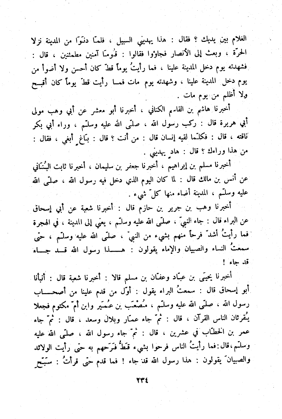 أَخْبَرَنَا وَهْبُ بْنُ جَرِيرِ بْنِ حَازِمٍ قَالَ: أَخْبَرَنَا شُعْبَةُ، عَنْ أَبِي إِسْحَاقَ، عَنِ الْبَرَاءِ قَالَ: §جَاءَ النَّبِيُّ صلّى الله عليه وسلم يَعْنِي إِلَى الْمَدِينَةِ فِي الْهِجْرَةِ، فَمَا رَأَيْتُ أَشَدَّ فَرَحًا مِنْهُمْ بِشَيْءٍ مِنَ النَّبِيِّ صلّى الله عليه وسلم حَتَّى سَمِعْتُ النِّسَاءَ وَالصِّبْيَانَ وَالْإِمَاءَ يَقُولُونَ: هَذَا رَسُولُ اللَّهِ قَدْ جَاءَ قَدْ جَاءَ