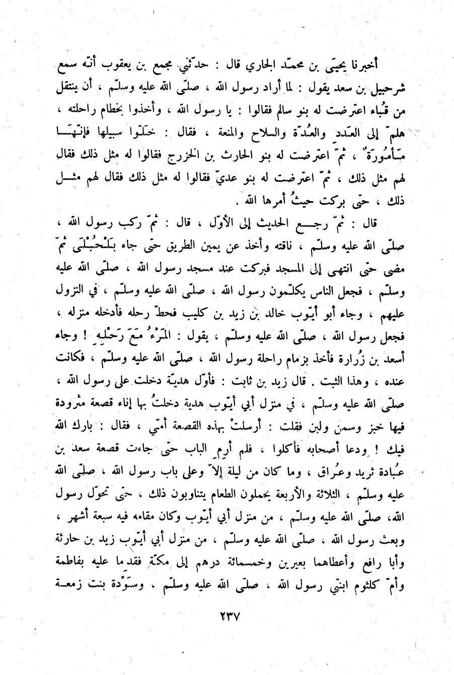 أَخْبَرَنَا يَحْيَى بْنُ مُحَمَّدٍ الْجَارِي قَالَ: حَدَّثَنِي مُجَمِّعُ بْنُ يَعْقُوبَ، أَنَّهُ سَمِعَ شُرَحْبِيلَ بْنَ سَعْدٍ يَقُولُ: لَمَّا أَرَادَ رَسُولُ اللَّهِ صلّى الله عليه وسلم أَنْ يَنْتَقِلَ مِنْ قُبَاءَ اعْتَرَضَتْ لَهُ بَنُو سَالِمٍ، فَقَالُوا: يَا رَسُولَ اللَّهِ وَأَخَذُوا بِخِطَامِ رَاحِلَتِهِ هَلُمَّ إِلَى الْعَدَدِ وَالْعُدَّةِ وَالسِّلَاحِ وَالْمَنَعَةِ، فَقَالَ: «§خَلُّوا سَبِيلَهَا فَإِنَّهَا مَأْمُورَةٌ» ثُمَّ اعْتَرَضَتْ لَهُ بَنُو الْحَارِثِ بْنُ الْخَزْرَجِ، فَقَالُوا لَهُ مِثْلَ ذَلِكَ، فَقَالَ لَهُمْ مِثْلَ ذَلِكَ، ثُمَّ اعْتَرَضَتْ لَهُ بَنُو عَدِيٍّ، فَقَالُوا لَهُ مِثْلَ ذَلِكَ، فَقَالَ لَهُمْ مِثْلَ ذَلِكَ حَتَّى بَرَكَتْ حَيْثُ أَمَرَهَا اللَّهُ، قَالَ ثُمَّ رَجَعَ الْحَدِيثُ إِلَى الْأَوَّلِ، قَالَ: ثُمَّ رَكِبَ رَسُولُ اللَّهِ صلّى الله عليه وسلم نَاقَتَهُ وَأَخَذَ عَنْ يَمِينِ الطَّرِيقِ حَتَّى جَاءَ بَلْحُبْلَى، ثُمَّ مَضَى حَتَّى انْتَهَى إِلَى الْمَسْجِدِ فَبَرَكَتْ عِنْدَ مَسْجِدِ رَسُولِ اللَّهِ صلّى الله عليه وسلم، فَجَعَلَ النَّاسُ يُكَلِّمُونَ رَسُولَ اللَّهِ صلّى الله عليه وسلم فِي النُّزُولِ عَلَيْهِمْ وَجَاءَ أَبُو أَيُّوبَ خَالِدُ بْنُ زَيْدِ بْنِ كُلَيْبٍ فَحَطَّ رَحْلَهُ فَأَدْخَلَهُ مَنْزِلَهُ، فَجَعَلَ رَسُولُ اللَّهِ صلّى الله عليه وسلم يَقُولُ: «الْمَرْءُ مَعَ رَحْلِهِ» وَجَاءَ أَسْعَدُ بْنُ زُرَارَةَ فَأَخَذَ بِزِمَامِ رَاحِلَةِ رَسُولِ اللَّهِ صلّى الله عليه وسلم فَكَانَتْ عِنْدَهُ، وَهَذَا الثَّبْتُ. قَالَ زَيْدُ بْنُ ثَابِتٍ: فَأَوَّلُ هَدِيَّةٍ دَخَلَتْ عَلَى رَسُولِ اللَّهِ صلّى الله عليه وسلم فِي مَنْزِلِ أَبِي أَيُّوبَ هَدِيَّةٌ دَخَلْتُ بِهَا: إِنَاءٌ قَصْعَةٌ مَثْرُودَةٌ، فِيهَا خُبْزٌ وَسَمْنٌ وَلَبَنٌ، فَقُلْتُ: أَرْسَلَتْ بِهَذِهِ الْقَصْعَةِ أُمِّي، فَقَالَ: «بَارَكَ اللَّهُ فِيكَ» وَدَعَا أَصْحَابَهُ فَأَكَلُوا فَلَمْ أَرْمِ الْبَابَ حَتَّى جَاءَتْ قَصْعَةُ سَعْدِ بْنِ عُبَادَةَ ثَرِيدٌ وَعِرَاقٌ، وَمَا كَانَ مِنْ لَيْلَةٍ إِلَّا وَعَلَى بَابِ رَسُولِ اللَّهِ صلّى الله عليه وسلم الثَّلَاثَةُ وَالْأَرْبَعَةُ يَحْمِلُونَ الطَّعَامَ يِتَنَاوَبُونَ ذَلِكَ حَتَّى تَحَوَّلَ رَسُولُ اللَّهِ صلّى الله عليه وسلم مِنْ مَنْزِلِ أَبِي أَيُّوبَ، وَكَانَ مُقَامُهُ فِيهِ سَبْعَةَ أَشْهُرٍ، وَبَعَثَ رَسُولُ اللَّهِ صلّى الله عليه وسلم مِنْ مَنْزِلِ أَبِي أَيُّوبَ زَيْدَ بْنَ حَارِثَةَ وَأَبَا رَافِعٍ وَأَعْطَاهُمَا بَعِيرَيْنِ وَخَمْسَمِائَةِ دِرْهَمٍ إِلَى مَكَّةَ فَقَدِمَا عَلَيْهِ بِفَاطِمَةَ وَأُمِّ كُلْثُومٍ ابْنَتِي رَسُولِ اللَّهِ صلّى الله عليه وسلم وَسَوْدَةَ بِنْتَ زَمْعَةَ