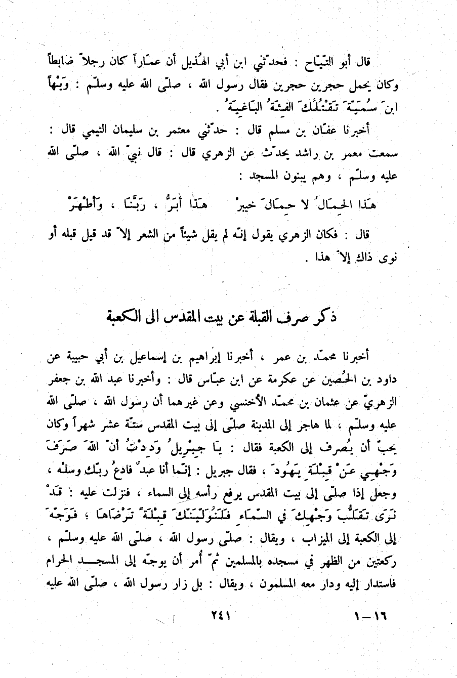 أَخْبَرَنَا مُحَمَّدُ بْنُ عُمَرَ، أَخْبَرَنَا إِبْرَاهِيمُ بْنُ إِسْمَاعِيلَ بْنِ أَبِي حَبِيبَةَ، عَنْ دَاوُدَ بْنِ الْحُصَيْنِ، عَنْ عِكْرِمَةَ، عَنِ ابْنِ عَبَّاسٍ قَالَ: وَأَخْبَرَنَا عَبْدُ اللَّهِ بْنُ جَعْفَرٍ الزُّهْرِيُّ، عَنْ عُثْمَانَ بْنِ مُحَمَّدٍ الْأَخْنَسِيِّ، وَعَنْ غَيْرِهِمَا أَنَّ رَسُولَ اللَّهِ صلّى الله عليه وسلم لَمَّا هَاجَرَ إِلَى الْمَدِينَةِ صَلَّى إِلَى بَيْتِ الْمَقْدِسِ سِتَّةَ عَشَرَ شَهْرًا، وَكَانَ يُحِبُّ أَنْ يُصْرَفَ إِلَى الْكَعْبَةِ، فَقَالَ: «يَا جِبْرِيلُ §وَدِدْتُ أَنَّ اللَّهَ صَرَفَ وَجْهِي عَنْ قِبْلَةِ يَهُودَ» فَقَالَ جِبْرِيلُ: إِنَّمَا أَنَا عَبْدٌ، فَادْعُ رَبَّكَ وَسَلْهُ، وَجَعَلَ إِذَا صَلَّى إِلَى بَيْتِ الْمَقْدِسِ يَرْفَعُ رَأْسَهُ إِلَى السَّمَاءِ فَنَزَلَتْ عَلَيْهِ {قَدْ نَرَى تَقَلُّبَ وَجْهِكَ فِي السَّمَاءِ فَلَنُوَلِّيَنَّكَ قِبْلَةً تَرْضَاهَا} [البقرة: 144] فَوُجِّهَ إِلَى الْكَعْبَةِ إِلَى الْمِيزَابِ وَيُقَالُ: صَلَّى رَسُولُ اللَّهِ صلّى الله عليه وسلم رَكْعَتَيْنِ مِنَ الظُّهْرِ فِي مَسْجِدِهِ بِالْمُسْلِمِينَ، ثُمَّ أُمِرَ أَنْ يُوَجِّهَ إِلَى الْمَسْجِدِ الْحَرَامِ فَاسْتَدَارَ إِلَيْهِ، وَدَارَ مَعَهُ الْمُسْلِمُونَ، وَيُقَالُ: بَلْ زَارَ رَسُولُ اللَّهِ صلّى الله عليه -[242]- وسلم أُمَّ بِشْرِ بْنِ الْبَرَاءِ بْنِ مَعْرُورٍ فِي بَنِي سَلِمَةَ فَصَنَعَتْ لَهُ طَعَامًا وَحَانَتِ الظُّهْرُ فَصَلَّى رَسُولُ اللَّهِ صلّى الله عليه وسلم بِأَصْحَابِهِ رَكْعَتَيْنِ ثُمَّ أُمِرَ أَنْ يُوَجِّهَ إِلَى الْكَعْبَةِ فَاسْتَدَارَ إِلَى الْكَعْبَةِ وَاسْتَقْبَلَ الْمِيزَابَ فَسُمِّيَ الْمَسْجِدُ: مَسْجِدُ الْقِبْلَتَيْنِ وَذَلِكَ يَوْمَ الِاثْنَيْنِ لِلنِّصْفِ مِنْ رَجَبٍ عَلَى رَأْسِ سَبْعَةَ عَشَرَ شَهْرًا وَفُرِضَ صَوْمُ شَهْرِ رَمَضَانَ فِي شَعْبَانَ عَلَى رَأْسِ ثَمَانِيَةَ عَشَرَ شَهْرًا قَالَ مُحَمَّدُ بْنُ عُمَرَ: وَهَذَا الثَّبْتُ عِنْدَنَا