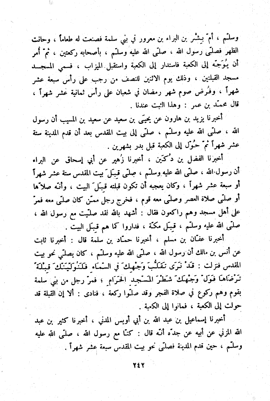 أَخْبَرَنَا يَزِيدُ بْنُ هَارُونَ، عَنْ يَحْيَى بْنِ سَعِيدٍ، عَنْ سَعِيدِ بْنِ الْمُسَيِّبِ أَنَّ رَسُولَ اللَّهِ صلّى الله عليه وسلم §صَلَّى إِلَى بَيْتِ الْمَقْدِسِ بَعْدَ أَنْ قَدِمَ الْمَدِينَةَ سِتَّةَ عَشَرَ شَهْرًا، ثُمَّ حُوِّلَ إِلَى الْكَعْبَةِ قَبْلَ بَدْرٍ بِشَهْرَيْنِ