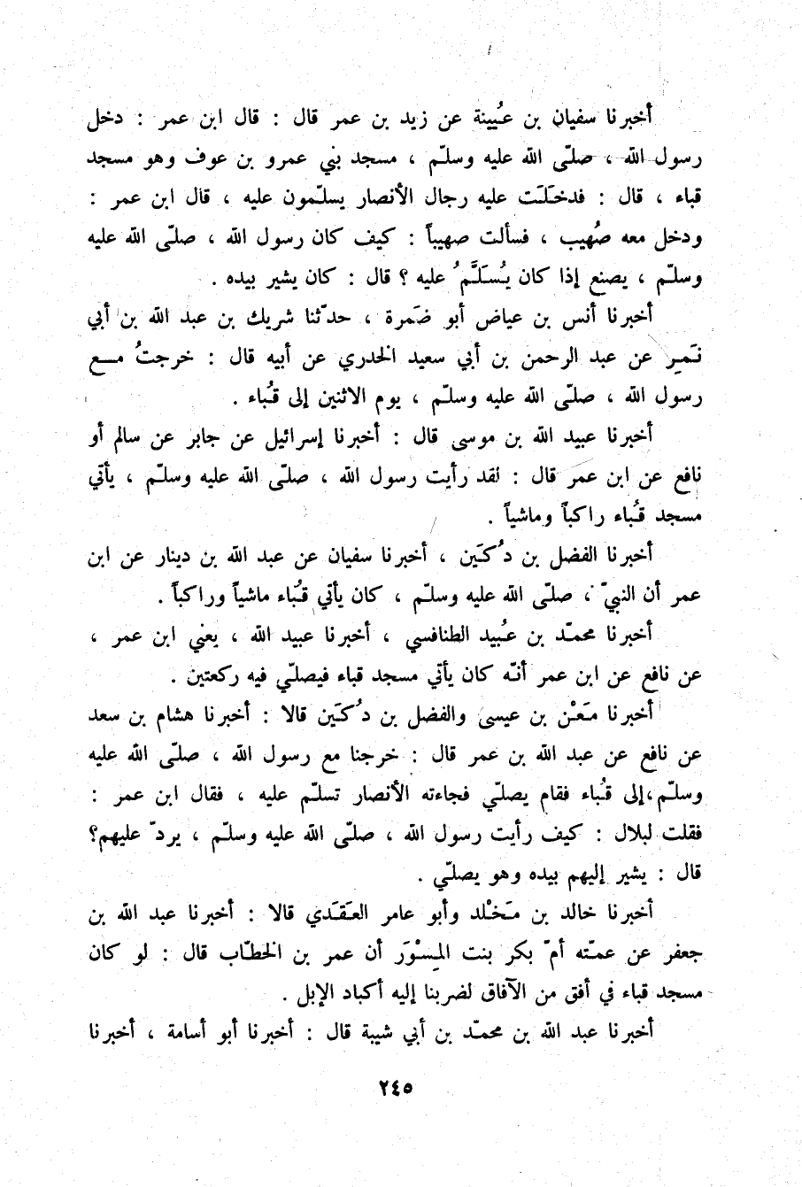 أَخْبَرَنَا سُفْيَانُ بْنُ عُيَيْنَةَ، عَنْ زَيْدِ بْنِ عُمَرَ قَالَ: قَالَ ابْنُ عُمَرَ: دَخَلَ رَسُولُ اللَّهِ صلّى الله عليه وسلم مَسْجِدَ بَنِي عَمْرِو بْنِ عَوْفٍ وَهُوَ مَسْجِدُ قُبَاءَ قَالَ: فَدَخَلَتْ عَلَيْهِ رِجَالُ الْأَنْصَارِ يُسَلِّمُونَ عَلَيْهِ قَالَ ابْنُ عُمَرَ: وَدَخَلَ مَعَهُ صُهَيْبٌ فَسَأَلْتُ صُهَيْبًا: كَيْفَ كَانَ رَسُولُ اللَّهِ صلّى الله عليه وسلم يَصْنَعُ إِذَا كَانَ يُسَلَّمُ عَلَيْهِ؟ قَالَ: «كَانَ §يُشِيرُ بِيَدِهِ»