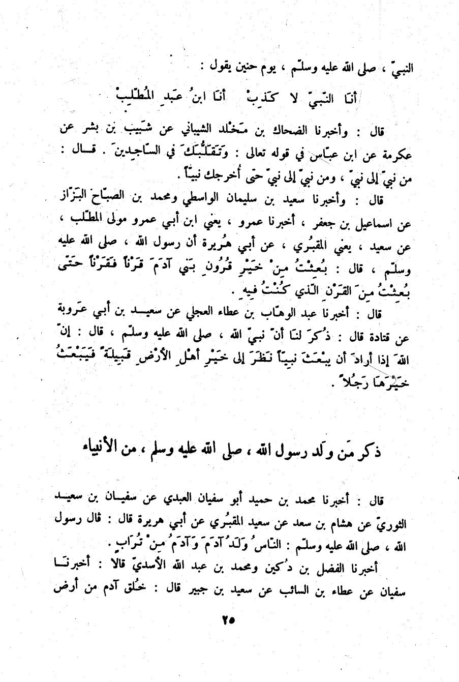 قَالَ: أَخْبَرَنَا مُحَمَّدُ بْنُ حُمَيْدٍ أَبُو سُفْيَانَ الْعَبْدِيُّ، عَنْ سُفْيَانَ بْنِ سَعِيدٍ الثَّوْرِيِّ، عَنْ هِشَامِ بْنِ سَعْدٍ، عَنْ سَعِيدٍ الْمَقْبُرِيِّ، عَنْ أَبِي هُرَيْرَةَ قَالَ: قَالَ رَسُولُ اللَّهِ صلّى الله عليه وسلم: «§النَّاسُ وَلَدُ آدَمَ وَآدَمُ مِنْ تُرَابٍ»