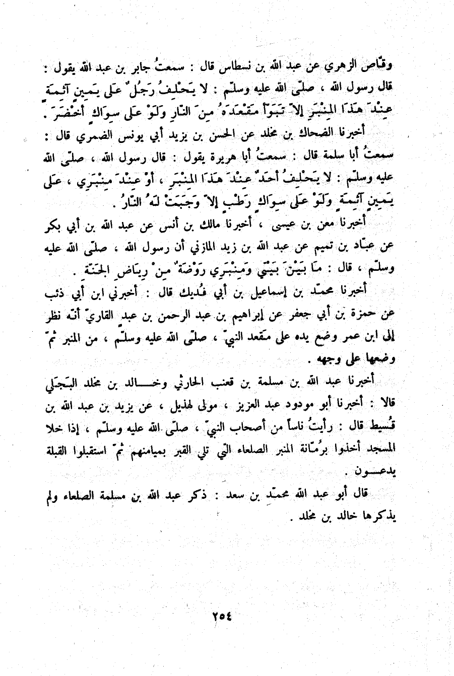 أَخْبَرَنَا عَبْدُ اللَّهِ بْنُ مَسْلَمَةَ بْنِ قَعْنَبٍ الْحَارِثِيُّ، وَخَالِدُ بْنُ مَخْلَدٍ الْبَجَلِيُّ قَالَا: أَخْبَرَنَا أَبُو مَوْدُودٍ عَبْدُ الْعَزِيزِ مَوْلًى لِهُذَيْلٍ، عَنْ يَزِيدَ بْنِ عَبْدِ اللَّهِ بْنِ قُسَيْطٍ قَالَ: §رَأَيْتُ نَاسًا مِنْ أَصْحَابِ النَّبِيِّ صلّى الله عليه وسلم إِذَا خَلَا الْمَسْجِدُ أَخَذُوا بِرُمَّانَةِ الْمِنْبَرِ الصَّلْعَاءِ الَّتِي تَلِي الْقَبْرَ بِمَيَامِنِهِمْ ثُمَّ اسْتَقْبَلُوا الْقِبْلَةَ يَدْعُونَ، قَالَ أَبُو عَبْدِ اللَّهِ مُحَمَّدُ بْنُ سَعْدٍ ذَكَرَ عَبْدُ اللَّهِ بْنُ مَسْلَمَةَ الصَّلْعَاءَ وَلَمْ يَذْكُرْهَا خَالِدُ بْنُ مَخْلَدٍ