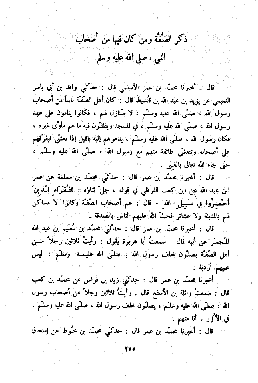 قَالَ: أَخْبَرَنَا مُحَمَّدُ بْنُ عُمَرَ الْأَسْلَمِيُّ قَالَ: حَدَّثَنِي وَاقِدُ بْنُ أَبِي يَاسِرٍ التَّمِيمِيُّ، عَنْ يَزِيدَ بْنِ عَبْدِ اللَّهِ بْنِ قُسَيْطٍ قَالَ: كَانَ §أَهْلُ الصُّفَّةِ نَاسًا مِنْ أَصْحَابِ رَسُولِ اللَّهِ صلّى الله عليه وسلم لَا مَنَازِلَ لَهُمْ، فَكَانُوا يَنَامُونَ عَلَى عَهْدِ رَسُولِ اللَّهِ صلّى الله عليه وسلم فِي الْمَسْجِدِ وَيَظَلُّونَ فِيهِ مَا لَهُمْ مَأْوًى غَيْرَهُ، فَكَانَ رَسُولُ اللَّهِ صلّى الله عليه وسلم يَدْعُوهُمْ إِلَيْهِ بِاللَّيْلِ إِذَا تَعَشَّى فَيُفَرِّقُهُمْ عَلَى أَصْحَابِهِ، وَتَتَعَشَّى طَائِفَةٌ مِنْهُمْ مَعَ رَسُولِ اللَّهِ صلّى الله عليه وسلم حَتَّى جَاءَ اللَّهُ تَعَالَى بِالْغِنَى
