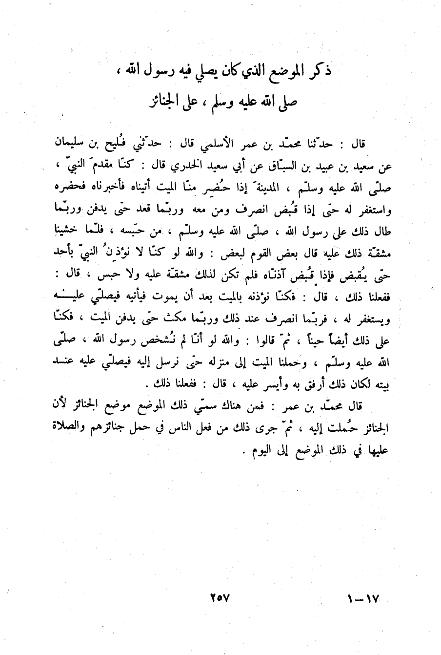 قَالَ: حَدَّثَنَا مُحَمَّدُ بْنُ عُمَرَ الْأَسْلَمِيُّ قَالَ: حَدَّثَنِي فُلَيْحُ بْنُ سُلَيْمَانَ، عَنْ سَعِيدِ بْنِ عُبَيْدِ بْنِ السَّبَّاقِ، عَنْ أَبِي سَعِيدٍ الْخُدْرِيِّ قَالَ: " كُنَّا مَقْدَمَ النَّبِيِّ صلّى الله عليه وسلم الْمَدِينَةَ §إِذَا حَضَرَ مِنَّا الْمَيِّتُ أَتَيْنَاهُ فَأَخْبَرْنَاهُ فَحَضَرَهُ وَاسْتَغْفَرَ لَهُ حَتَّى إِذَا قُبِضَ انْصَرَفَ وَمَنْ مَعَهُ، وَرُبَّمَا قَعَدَ حَتَّى يُدْفَنَ، وَرُبَّمَا طَالَ ذَلِكَ عَلَى رَسُولِ اللَّهِ صلّى الله عليه وسلم مِنْ حَبْسِهِ، فَلَمَّا خَشِينَا مَشَقَّةَ ذَلِكَ عَلَيْهِ قَالَ بَعْضُ الْقَوْمِ لِبَعْضٍ: وَاللَّهِ لَوْ كُنَّا لَا نُؤْذِنُ النَّبِيَّ بِأَحَدٍ حَتَّى يُقْبَضَ فَإِذَا قُبِضَ آذَنَّاهُ فَلَمْ تَكُنْ لِذَلِكَ مَشَقَّةٌ عَلَيْهِ وَلَا حُبِسَ، قَالَ: فَفَعَلْنَا ذَلِكَ، قَالَ: فَكُنَّا نُؤْذِنُهُ بِالْمَيِّتِ بَعْدَ أَنْ يَمُوتَ فَيَأْتِيَهُ فَيُصَلِّيَ عَلَيْهِ وَيَسْتَغْفِرَ لَهُ فَرُبَّمَا انْصَرَفَ عِنْدَ ذَلِكَ، وَرُبَّمَا مَكَثَ حَتَّى يُدْفَنَ الْمَيِّتُ فَكُنَّا عَلَى ذَلِكَ أَيْضًا حِينًا، ثُمَّ قَالُوا: وَاللَّهِ لَوْ أَنَّا لَمْ نُشْخِصْ رَسُولَ اللَّهِ صلّى الله عليه وسلم وَحَمَلْنَا الْمَيِّتَ إِلَى مَنْزِلِهِ حَتَّى نُرْسِلَ إِلَيْهِ فَيُصَلِّيَ عَلَيْهِ عِنْدَ بَيْتِهِ لَكَانَ ذَلِكَ أَرْفَقَ بِهِ وَأَيْسَرَ عَلَيْهِ، قَالَ: فَفَعَلْنَا ذَلِكَ، قَالَ مُحَمَّدُ بْنُ عُمَرَ فَمِنْ هُنَاكَ سُمِّيَ ذَلِكَ الْمَوْضِعُ مَوْضِعَ الْجَنَائِزِ؛ لِأَنَّ الْجَنَائِزَ حُمِلَتْ إِلَيْهِ ثُمَّ جَرَى ذَلِكَ مِنْ فِعْلِ النَّاسِ فِي حَمْلِ جَنَائِزِهِمْ وَالصَّلَاةِ عَلَيْهَا فِي ذَلِكَ الْمَوْضِعِ إِلَى الْيَوْمِ