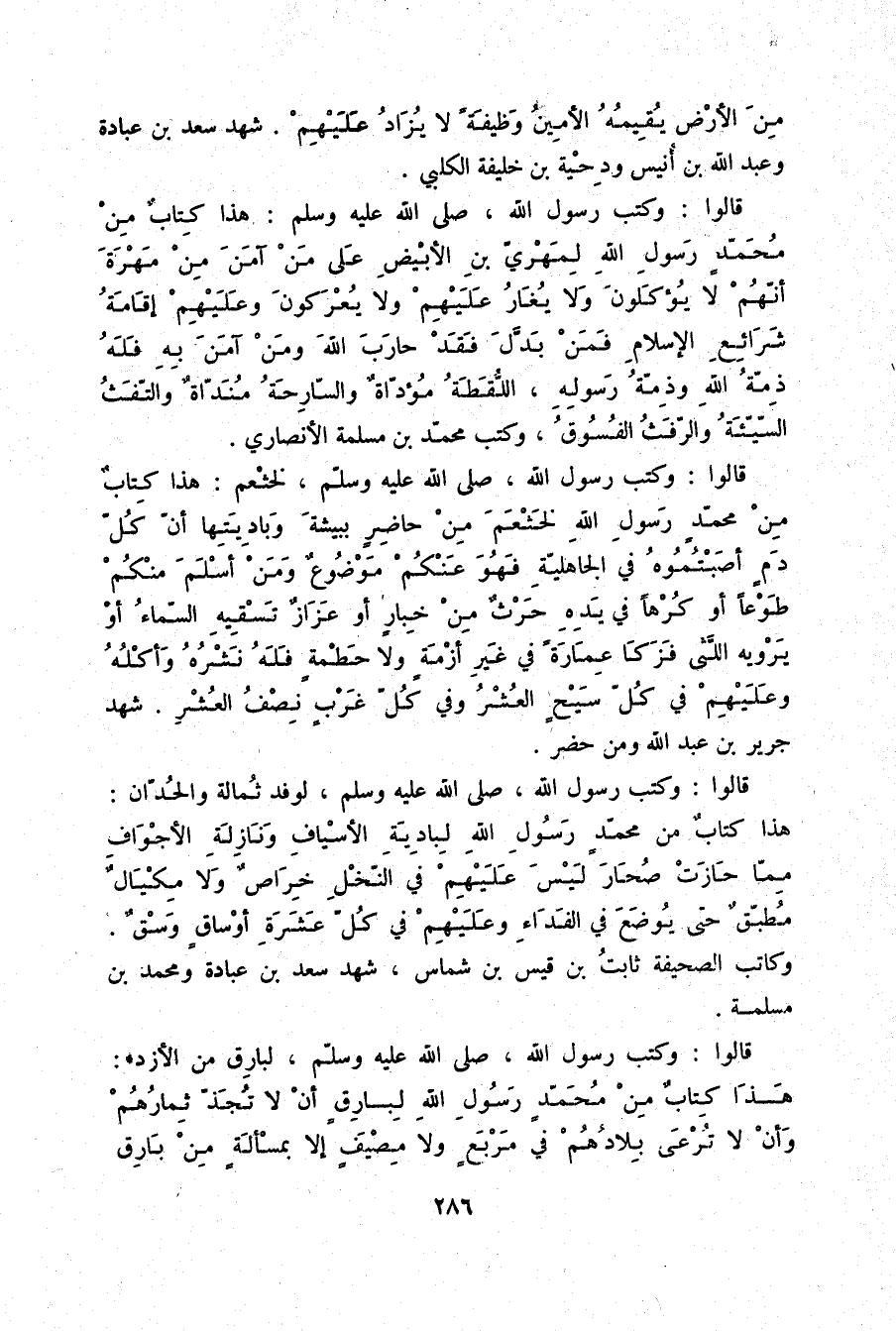 مِنَ الْأَرْضِ يُقِيمُهُ الْأَمِينُ وَظِيفَةً لَا يُزَادُ عَلَيْهِمْ» ، شَهِدَ سَعْدُ بْنُ عُبَادَةَ وَعَبْدُ اللَّهِ بْنُ أُنَيْسٍ وَدِحْيَةُ بْنُ خَلِيفَةَ الْكَلْبِيُّ قَالُوا: وَكَتَبَ رَسُولُ اللَّهِ صلّى الله عليه وسلم: «هَذَا كِتَابٌ مِنْ مُحَمَّدٍ رَسُولِ اللَّهِ لِمَهْرِيِّ بْنِ الْأَبْيَضِ عَلَى مَنْ آمَنَ مِنْ مَهْرَةَ أَنَّهُمْ لَا يُؤْكَلُونَ وَلَا يُغَارُ عَلَيْهِمْ وَلَا يُعْرَكُونَ وَعَلَيْهِمْ إِقَامَةُ شَرَائِعِ الْإِسْلَامِ فَمَنْ بَدَّلَ فَقَدْ حَارَبَ اللَّهَ وَمَنْ آمَنَ بِهِ فَلَهُ ذِمَّةُ اللَّهِ وَذِمَّةُ رَسُولِهِ اللُّقَطَةُ مُؤَدَّاةٌ وَالسَّارِحَةُ مُنَدَّاةٌ وَالتَّفَثُ السَّيِّئَةُ وَالرَّفَثُ الْفُسُوقُ» ، وَكَتَبَ مُحَمَّدُ بْنُ مَسْلَمَةَ الْأَنْصَارِيُّ قَالُوا: وَكَتَبَ رَسُولُ اللَّهِ صلّى الله عليه وسلم لِخَثْعَمَ: «هَذَا كِتَابٌ مِنْ مُحَمَّدٍ رَسُولِ اللَّهِ لِخَثْعَمَ مِنْ حَاضِرٍ بِبَيْشَةَ وَبَادِيَتِهَا أَنَّ كُلَّ دَمٍ أَصَبْتُمُوهُ فِي الْجَاهِلِيَّةِ فَهُوَ عَنْكُمْ مَوْضُوعٌ وَمَنْ أَسْلَمَ مِنْكُمْ طَوْعًا أَوْ كَرْهًا فِي يَدِهِ حَرْثٌ مِنْ خِبَارٍ أَوْ عَزَازٌ تَسْقِيهِ السَّمَاءُ أَوْ يَرْوِيهِ اللَّثَى فَزَكَا عُمَارَةً فِي غَيْرِ أَزِمَةٍ وَلَا حَطْمَةٍ فَلَهُ نَشْرُهُ وَأَكْلُهُ وَعَلَيْهِمْ فِي كُلِّ سَيْحٍ الْعُشْرُ وَفِي كُلِّ غَرْبٍ نِصْفُ الْعُشْرِ» ، شَهِدَ جَرِيرُ بْنُ عَبْدِ اللَّهِ وَمَنْ حَضَرَ قَالُوا: وَكَتَبَ رَسُولُ اللَّهِ صلّى الله عليه وسلم لِوَفْدِ ثُمَالَةَ وَالْحُدَّانِ: «هَذَا كِتَابٌ مِنْ مُحَمَّدٍ رَسُولِ اللَّهِ لِبَادِيَةِ الْأَسْيَافِ وَنَازِلَةِ الْأَجْوَافِ مِمَّا حَازَتْ صُحَارَ لَيْسَ عَلَيْهِمْ فِي النَّخْلِ خِرَاصٌ وَلَا مِكْيَالٌ مُطْبِقٌ حَتَّى يُوضَعَ فِي الْفَدَاءِ وَعَلَيْهِمْ فِي كُلِّ عَشَرَةِ أَوْسَاقٍ وَسْقٌ» وَكَاتِبُ الصَّحِيفَةِ ثَابِتُ بْنُ قَيْسِ بْنِ شَمَّاسٍ شَهِدَ سَعْدُ بْنُ عُبَادَةَ وَمُحَمَّدُ بْنُ مَسْلَمَةَ قَالُوا: وَكَتَبَ رَسُولُ اللَّهِ صلّى الله عليه وسلم لِبَارِقٍ مِنَ الْأَزْدِ: «هَذَا كِتَابٌ مِنْ مُحَمَّدٍ رَسُولِ اللَّهِ لِبَارِقٍ أَنْ لَا تُجَذَّ ثِمَارُهُمْ وَأَنْ لَا تُرْعَى بِلَادُهُمْ فِي مَرْبَعٍ وَلَا مَصِيفٍ إِلَّا بِمَسْأَلَةٍ مِنْ بَارِقٍ