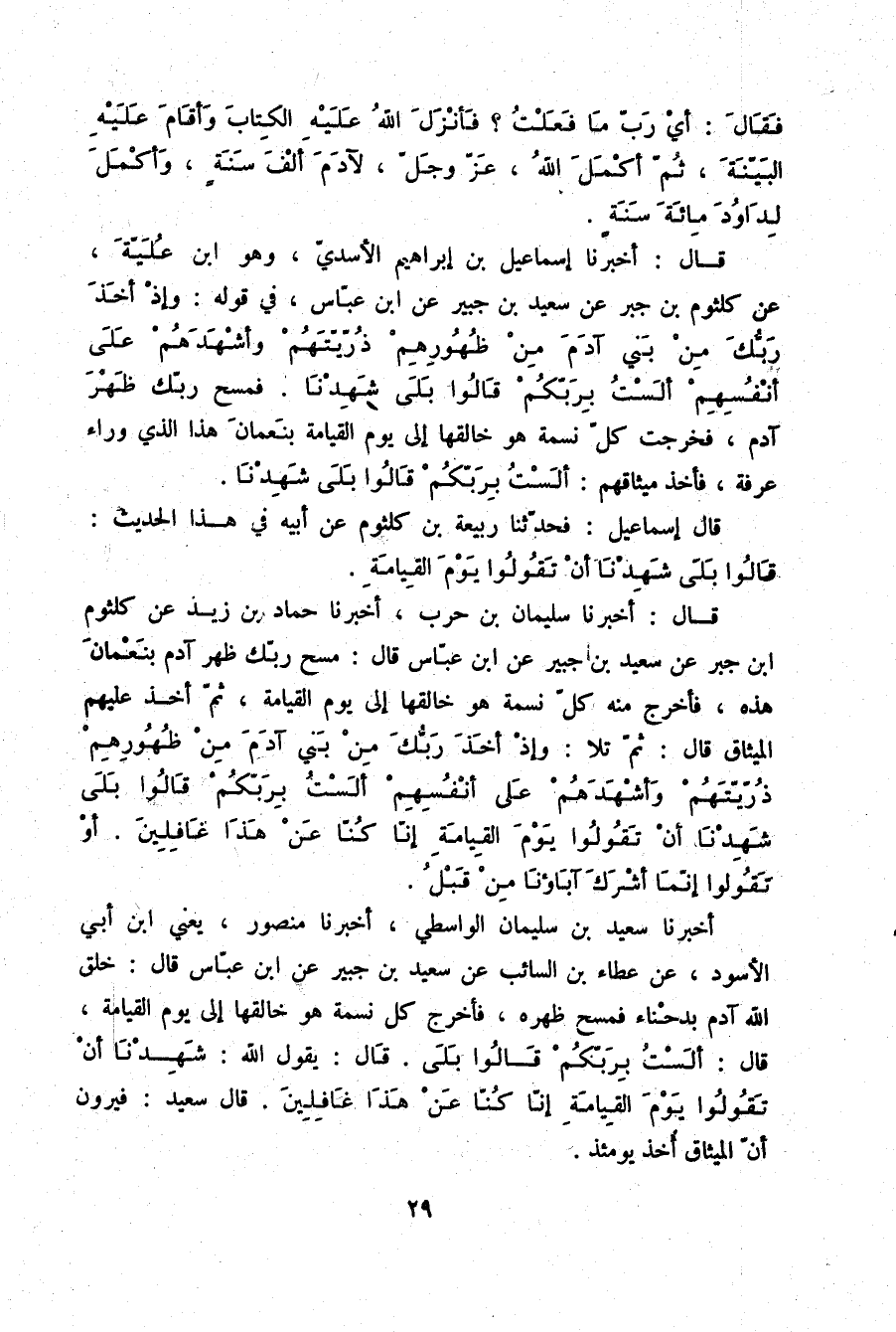 قَالَ: أَخْبَرَنَا إِسْمَاعِيلُ بْنُ إِبْرَاهِيمَ الْأَسَدِيُّ، وَهُوَ ابْنُ عُلَيَّةَ عَنْ كُلْثُومِ بْنِ جَبْرٍ، عَنْ سَعِيدِ بْنِ جُبَيْرٍ، عَنِ ابْنِ عَبَّاسٍ، فِي قَوْلِهِ {§وَإِذْ أَخَذَ رَبُّكَ مِنْ بَنِي آدَمَ مِنْ ظُهُورِهِمْ ذُرِّيَّتَهُمْ وَأَشْهَدَهُمْ عَلَى أَنْفُسِهِمْ أَلَسْتُ بِرَبِّكُمْ قَالُوا بَلَى شَهِدْنَا} [الأعراف: 172] فَمَسَحَ رَبُّكَ ظَهْرَ آدَمَ فَخَرَجَتْ كُلُّ نَسَمَةٍ هُوَ خَالِقُهَا إِلَى يَوْمِ الْقِيَامَةِ بِنَعْمَانَ هَذَا الَّذِي وَرَاءَ عَرَفَةَ فَأَخَذَ مِيثَاقَهُمْ {أَلَسْتُ بِرَبِّكُمْ قَالُوا بَلَى شَهِدْنَا} [الأعراف: 172] قَالَ إِسْمَاعِيلُ: فَحَدَّثَنَا رَبِيعَةُ بْنُ كُلْثُومٍ، عَنْ أَبِيهِ، فِي هَذَا الْحَدِيثِ {قَالُوا بَلَى شَهِدْنَا أَنْ تَقُولُوا يَوْمَ الْقِيَامَةِ} [الأعراف: 172]