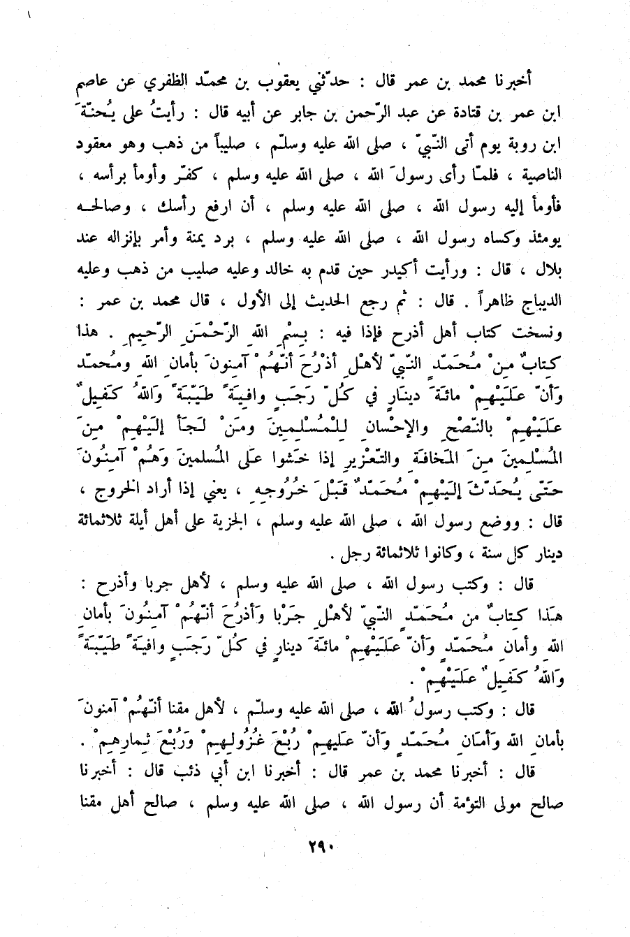أَخْبَرَنَا مُحَمَّدُ بْنُ عُمَرَ قَالَ: حَدَّثَنِي يَعْقُوبُ بْنُ مُحَمَّدٍ الظَّفَرِيُّ، عَنْ عَاصِمِ بْنِ عُمَرَ بْنِ قَتَادَةَ، عَنْ عَبْدِ الرَّحْمَنِ بْنِ جَابِرٍ، عَنْ أَبِيهِ قَالَ: رَأَيْتُ عَلَى يُحَنَّةَ بْنِ رُوبَةَ يَوْمَ أَتَى النَّبِيَّ صلّى الله عليه وسلم صَلِيبًا مِنْ ذَهَبٍ وَهُوَ مَعْقُودُ النَّاصِيَةِ فَلَمَّا رَأَى رَسُولَ اللَّهِ صلّى الله عليه وسلم كَفَّرَ وَأَوْمَأَ بِرَأْسِهِ §فَأَوْمَأَ إِلَيْهِ رَسُولُ اللَّهِ صلّى الله عليه وسلم أَنِ ارْفَعْ رَأْسَكَ وَصَالَحَهُ يَوْمَئِذٍ وَكَسَاهُ رَسُولُ اللَّهِ صلّى الله عليه وسلم بُرْدًا يَمَنِيَّةً وَأَمَرَ بِإِنْزَالِهِ عِنْدَ بِلَالٍ قَالَ: وَرَأَيْتُ أُكَيْدِرًا حِينَ قَدِمَ بِهِ خَالِدٌ وَعَلَيْهِ صَلِيبٌ مِنْ ذَهَبٍ وَعَلَيْهِ الدِّيبَاجُ ظَاهِرًا قَالَ: ثُمَّ رَجَعَ الْحَدِيثُ إِلَى الْأَوَّلِ قَالَ مُحَمَّدُ بْنُ عُمَرَ: وَنَسَخْتُ كِتَابَ أَهْلِ أَذْرُحَ فَإِذَا فِيهِ: «بِسْمِ اللَّهِ الرَّحْمَنِ الرَّحِيمِ هَذَا كِتَابٌ مِنْ مُحَمَّدٍ النَّبِيِّ لِأَهْلِ أَذْرُحَ أَنَّهُمْ آمِنُونَ بِأَمَانِ اللَّهِ وَمُحَمَّدٍ وَأَنَّ عَلَيْهِمْ مِائَةَ دِينَارٍ فِي كُلِّ رَجَبٍ وَافِيَةً طَيِّبَةً، وَاللَّهُ كَفِيلٌ عَلَيْهِمْ بِالنُّصْحِ وَالْإِحْسَانِ لِلْمُسْلِمِينَ، وَمَنْ لَجَأَ إِلَيْهِمْ مِنَ الْمُسْلِمِينَ مِنَ الْمَخَافَةِ وَالتَّعْزِيرِ إِذَا خَشُوا عَلَى الْمُسْلِمِينَ وَهُمْ آمِنُونَ حَتَّى يُحَدِّثَ إِلَيْهِمْ مُحَمَّدٌ قَبْلَ خُرُوجِهِ» يَعْنِي إِذَا أَرَادَ الْخُرُوجَ قَالَ: وَوَضَعَ رَسُولُ اللَّهِ صلّى الله عليه وسلم الْجِزْيَةَ عَلَى أَهْلِ أَيْلَةَ ثَلَاثَمِائَةِ دِينَارٍ كُلَّ سَنَةٍ، وَكَانُوا ثَلَاثَمِائَةِ رَجُلٍ قَالَ: وَكَتَبَ رَسُولُ اللَّهِ صلّى الله عليه وسلم لِأَهْلِ جَرْبَا وَأَذْرُحَ: «هَذَا كِتَابٌ مِنْ مُحَمَّدٍ النَّبِيِّ لِأَهْلِ جَرْبَا وَأَذْرُحَ أَنَّهُمْ آمِنُونَ بِأَمَانِ اللَّهِ وَأَمَانِ مُحَمَّدٍ وَأَنَّ عَلَيْهِمْ مِائَةَ دِينَارٍ فِي كُلِّ رَجَبٍ وَافِيَةً طَيِّبَةً وَاللَّهُ كَفِيلٌ عَلَيْهِمْ» قَالَ: وَكَتَبَ رَسُولُ اللَّهِ صلّى الله عليه وسلم لِأَهْلِ مَقْنَا «أَنَّهُمْ آمِنُونَ بِأَمَانِ اللَّهِ وَأَمَانِ مُحَمَّدٍ وَأَنَّ عَلَيْهِمْ رُبُعَ غُزُولِهِمْ وَرُبُعَ ثِمَارِهِمْ»
