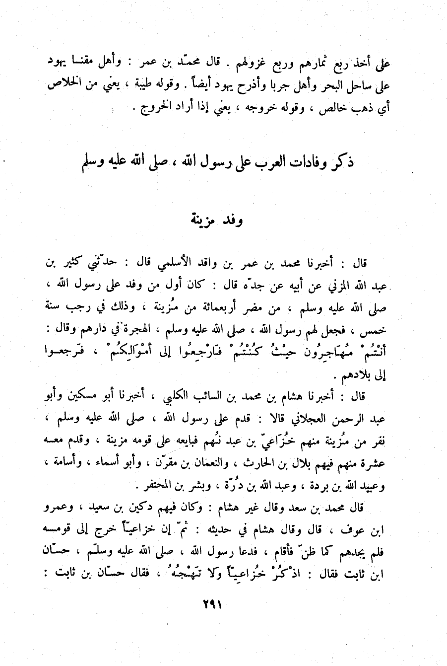 قَالَ: أَخْبَرَنَا مُحَمَّدُ بْنُ عُمَرَ بْنِ وَاقِدٍ الْأَسْلَمِيُّ قَالَ: حَدَّثَنِي كَثِيرُ بْنُ عَبْدِ اللَّهِ الْمُزَنِيُّ، عَنْ أَبِيهِ، عَنْ جَدِّهِ قَالَ: كَانَ أَوَّلَ مَنْ وَفَدَ عَلَى رَسُولِ اللَّهِ صلّى الله عليه وسلم مِنْ مُضَرَ أَرْبَعُمِائَةٍ مِنْ مُزَيْنَةَ، وَذَلِكَ فِي رَجَبٍ سَنَةَ خَمْسٍ فَجَعَلَ لَهُمْ رَسُولُ اللَّهِ صلّى الله عليه وسلم الْهِجْرَةَ فِي دَارِهِمْ، وَقَالَ: «§أَنْتُمْ مُهَاجِرُونَ حَيْثُ كُنْتُمْ فَارْجِعُوا إِلَى أَمْوَالِكُمْ» فَرَجَعُوا إِلَى بِلَادِهِمْ