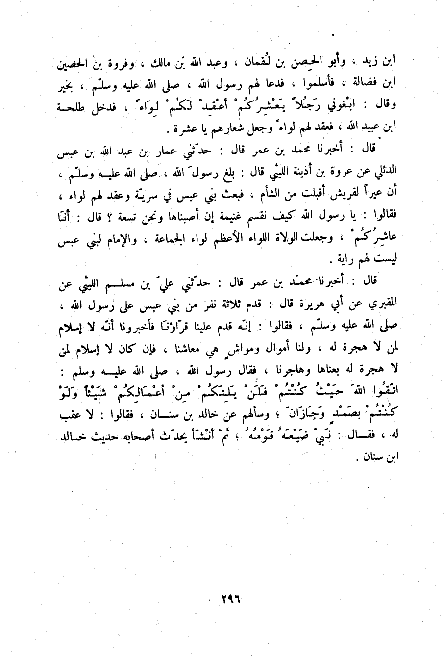 قَالَ: أَخْبَرَنَا مُحَمَّدُ بْنُ عُمَرَ قَالَ: حَدَّثَنِي عَلِيُّ بْنُ مُسْلِمٍ اللَّيْثِيُّ، عَنِ الْمَقْبُرِيِّ، عَنْ أَبِي هُرَيْرَةَ قَالَ: قَدِمَ ثَلَاثَةُ نَفَرٍ مِنْ بَنِي عَبْسٍ عَلَى رَسُولِ اللَّهِ صلّى الله عليه وسلم فَقَالُوا: إِنَّهُ قَدِمَ عَلَيْنَا قُرَّاؤُنَا فَأَخْبَرُونَا أَنَّهُ لَا إِسْلَامَ لِمَنْ لَا هِجْرَةَ لَهُ، وَلَنَا أَمْوَالٌ وَمَوَاشٍ هِيَ مَعَاشُنَا، فَإِنْ كَانَ لَا إِسْلَامَ لِمَنْ لَا هِجْرَةَ لَهُ بِعْنَاهَا وَهَاجَرْنَا، فَقَالَ رَسُولُ اللَّهِ صلّى الله عليه وسلم: «§اتَّقُوا اللَّهَ حَيْثُ كُنْتُمْ فَلَنْ يَلِتَكُمْ مِنْ أَعْمَالِكُمْ شَيْئًا وَلَوْ كُنْتُمْ بِصَمَدٍ وَجَازَانَ» وَسَأَلَهُمْ عَنْ خَالِدِ بْنِ سِنَانٍ، فَقَالُوا: لَا عَقِبَ لَهُ، فَقَالَ: «نَبِيٌّ ضَيَّعَهُ قَوْمُهُ» ، ثُمَّ أَنْشَأَ يُحَدِّثُ أَصْحَابَهُ حَدِيثَ خَالِدِ بْنِ سِنَانٍ
