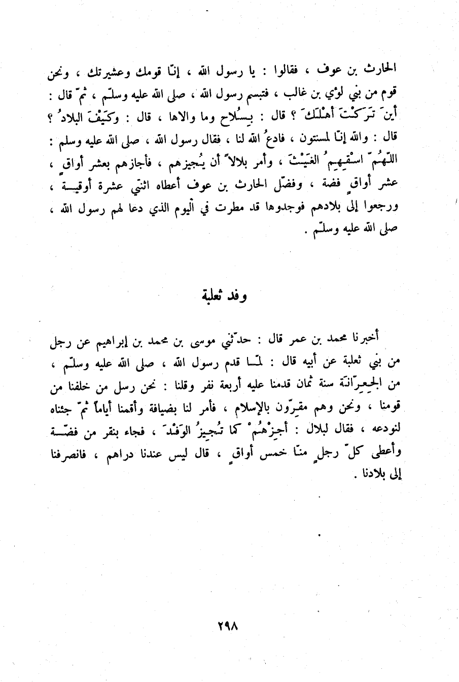 أَخْبَرَنَا مُحَمَّدُ بْنُ عُمَرَ قَالَ: حَدَّثَنِي مُوسَى بْنُ مُحَمَّدِ بْنِ إِبْرَاهِيمَ، عَنْ رَجُلٍ، مِنْ بَنِي ثَعْلَبَةَ عَنْ أَبِيهِ قَالَ: لَمَّا قَدِمَ رَسُولُ اللَّهِ صلّى الله عليه وسلم مِنَ الْجِعْرَانَةِ سَنَةَ ثَمَانٍ قَدِمْنَا عَلَيْهِ أَرْبَعَةُ نَفَرٍ وَقُلْنَا: نَحْنُ رُسُلُ مَنْ خَلْفَنَا مِنْ قَوْمِنَا وَنَحْنُ وَهُمْ مُقِرُّونَ بِالْإِسْلَامِ فَأَمَرَ لَنَا بِضِيَافَةٍ وَأَقَمْنَا أَيَّامًا ثُمَّ جِئْنَاهُ لِنَوَدِّعَهُ فَقَالَ لِبِلَالٍ: «§أَجِزْهُمْ كَمَا تُجِيزُ الْوَفْدَ» ، فَجَاءَ بِنَقَرٍ مِنْ فِضَّةٍ وَأَعْطَى كُلَّ رَجُلٍ مِنَّا خَمْسَ أَوَاقٍ قَالَ: لَيْسَ عِنْدَنَا دَرَاهِمُ فَانْصَرَفْنَا إِلَى بِلَادِنَا