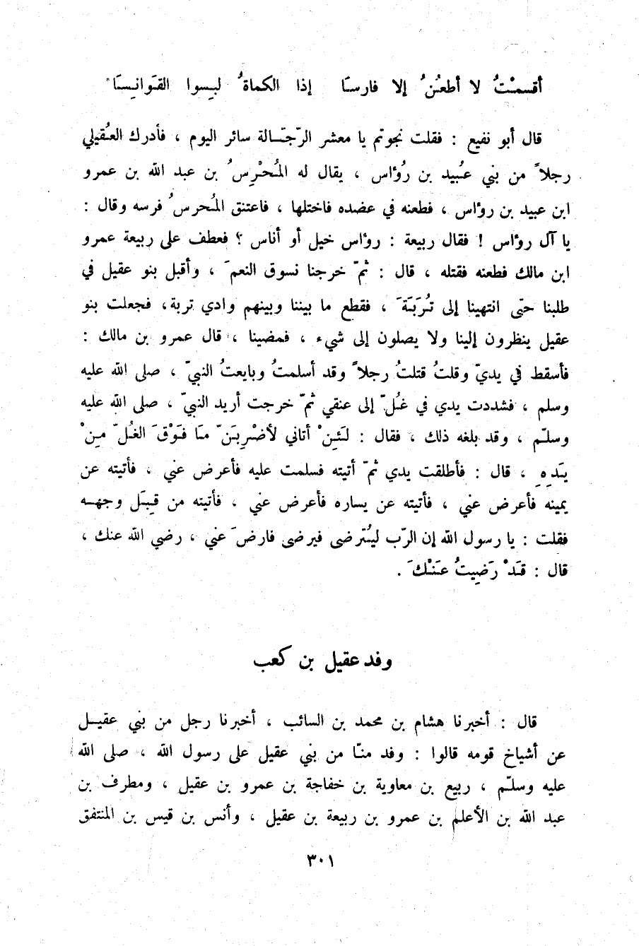 قَالَ: أَخْبَرَنَا هِشَامُ بْنُ مُحَمَّدِ بْنِ السَّائِبِ، أَخْبَرَنَا رَجُلٌ مِنْ بَنِي عَقِيلٍ، عَنْ أَشْيَاخِ قَوْمِهِ قَالُوا: وَفَدَ مِنَّا مِنْ بَنِي عَقِيلٍ عَلَى رَسُولِ اللَّهِ صلّى الله عليه وسلم رَبِيعُ بْنُ مُعَاوِيَةَ بْنِ خَفَاجَةَ بْنِ عَمْرِو بْنِ عَقِيلٍ وَمُطَرِّفُ بْنُ عَبْدِ اللَّهِ بْنِ الْأَعْلَمِ بْنِ عَمْرِو بْنِ رَبِيعَةَ بْنِ عَقِيلٍ وَأَنَسُ بْنُ قَيْسِ بْنِ الْمُنْتَفِقِ