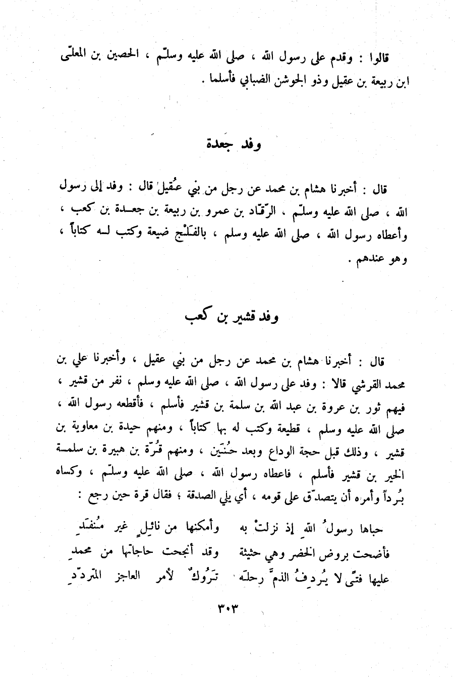 قَالَ: أَخْبَرَنَا هِشَامُ بْنُ مُحَمَّدٍ، عَنْ رَجُلٍ مِنْ بَنِي عَقِيلٍ وَأَخْبَرَنَا عَلِيُّ بْنُ مُحَمَّدٍ الْقُرَشِيُّ قَالَا: §وَفَدَ عَلَى رَسُولِ اللَّهِ صلّى الله عليه وسلم نَفَرٌ مِنْ قُشَيْرٍ فِيهِمْ ثَوْرُ بْنُ عُرْوَةَ بْنِ عَبْدِ اللَّهِ بْنِ سَلَمَةَ بْنِ قُشَيْرٍ فَأَسْلَمَ فَأَقْطَعَهُ رَسُولُ اللَّهِ صلّى الله عليه وسلم قَطِيعَةً وَكَتَبَ لَهُ بِهَا كِتَابًا وَمِنْهُمْ حَيْدَةُ بْنُ مُعَاوِيَةَ بْنِ قُشَيْرٍ وَذَلِكَ قَبْلَ حَجَّةِ الْوَدَاعِ وَبَعْدَ حُنَيْنٍ وَمِنْهُمْ قُرَّةُ بْنُ هُبَيْرَةَ بْنِ سَلَمَةَ الْخَيْرِ بْنِ قُشَيْرٍ فَأَسْلَمَ فَأَعْطَاهُ رَسُولُ اللَّهِ صلّى الله عليه وسلم وَكَسَاهُ بُرْدًا وَأَمَرَهُ أَنْ يَتَصَدَّقَ عَلَى قَوْمِهِ أَيْ يَلِي الصَّدَقَةَ فَقَالَ قُرَّةُ حِينَ رَجَعَ: